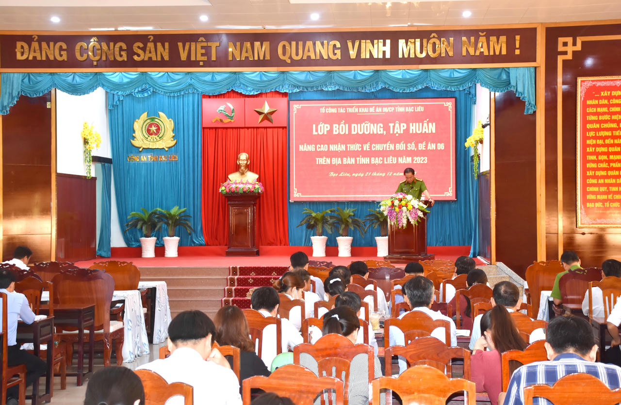 Phát biểu khai mạc Lớp bồi dưỡng, Đại tá Bùi Xuân Khởi - Phó Giám đốc Công an tỉnh, Tổ phó Tổ công tác triển khai Đề án 06/CP tỉnh Bạc Liêu, nhấn mạnh: “Nhằm đẩy mạnh thực hiện Đề án 06/CP, thời gian qua tỉnh Bạc Liêu tăng cường tuyên truyền, hướng dẫn người dân đăng ký, kích hoạt tài khoản định danh điện tử; triển khai kết nối Cơ sở dữ liệu quốc gia về dân cư với Cơ sở dữ liệu các chuyên ngành khác để số hóa và sử dụng kết quả số hóa hồ sơ, kết quả giải quyết các thủ tục hành chính phục vụ đăng ký, quản lý cư trú; cấp và quản lý CCCD; đăng ký hộ chiếu,… trên môi trường trực tuyến. Đây là một bước tiến mới trong việc thực hiện đồng bộ các giải pháp để người dân được tiếp cận gần hơn với dịch vụ công trực tuyến, từ đó đẩy nhanh tốc độ chuyển đổi số trên địa bàn tỉnh”.