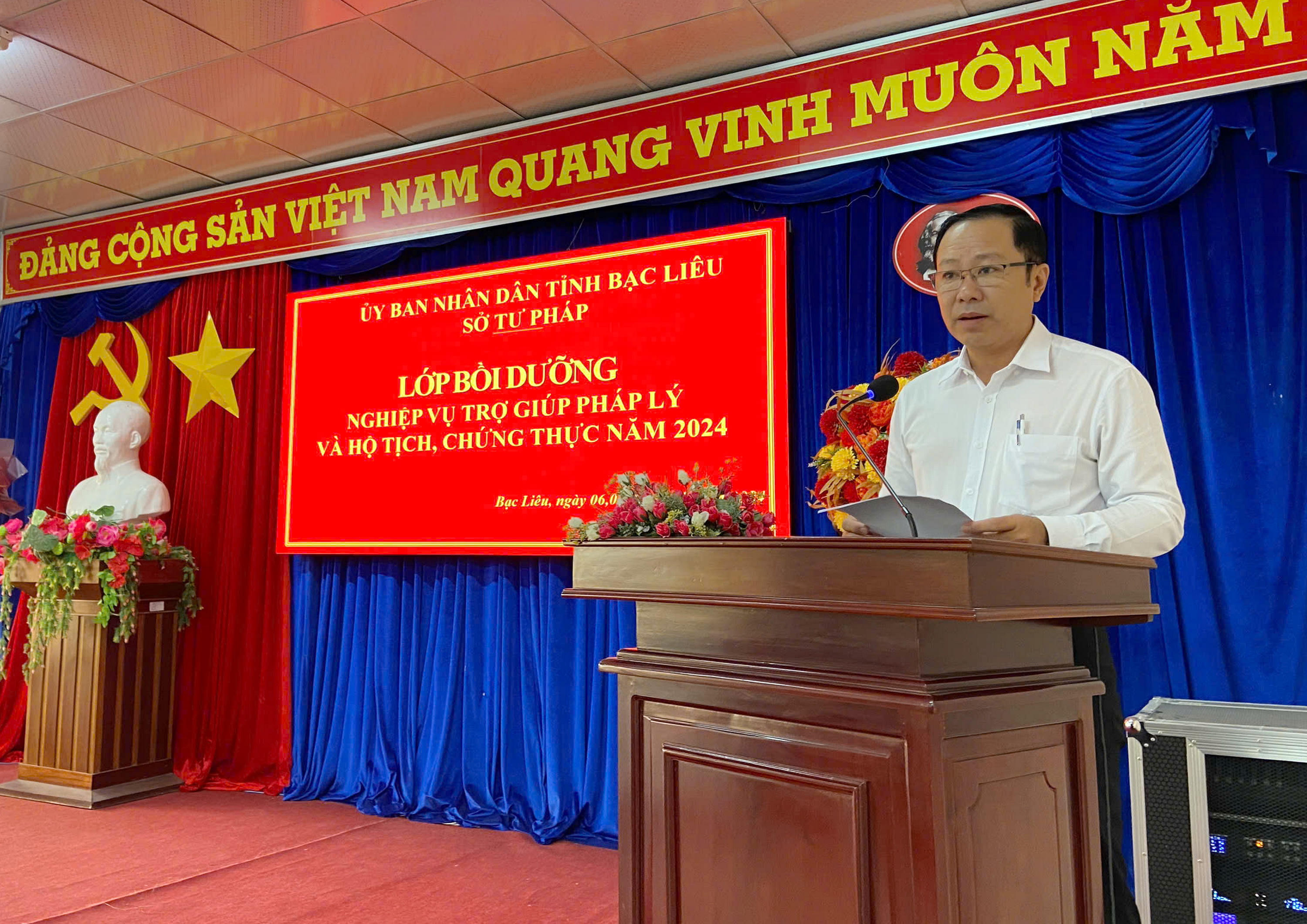 Ông Nguyễn Duy Tuấn - Phó Giám đốc Sở Tư pháp Bạc Liêu, phát biểu khai mạc lớp bồi dưỡng nghiệp vụ. |