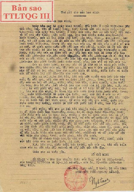 (PLO) - Ngày 5/9/1945 - 3 ngày sau khi đọc bản Tuyên ngôn độc lập khai sinh ra nước Việt Nam Dân chủ Cộng Hòa, Chủ tịch Hồ Chí Minh đã gửi thư cho học sinh nhân khai trường đầu tiên của nước Việt Nam độc lập mới.