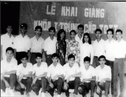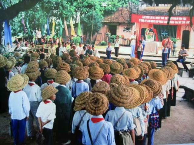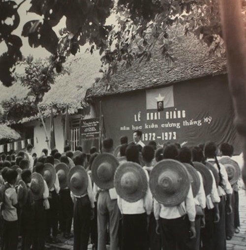 | Lễ khai giảng năm học mới của trường cấp II Dịch Vọng, Từ Liêm, Hà Nội năm 1972 - 1973 với khẩu hiệu "Năm học kiên cường thắng Mỹ". Tuy khó khăn nhưng lễ khai giảng vẫn được tổ chức. (Ảnh tư liệu) |