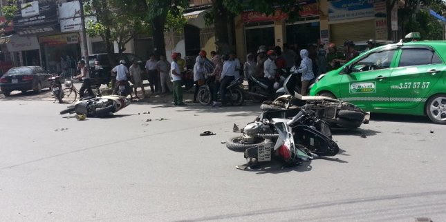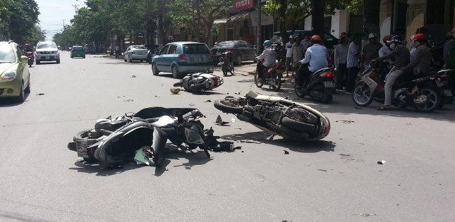 Lúc này có 2 chiếc xe máy khác BKS: 37B1-573.97 và 1 xe máy (chưa rõ BKS) chạy tới không kịp xử lý đã đâm mạnh vào 2 chiếc xe rồi ngã xuống đường. Tại hiện trường, 3 chiếc xe máy đều bị hư hỏng nặng, 3 người đi xe máy bị thương nặng được người dân đưa đi cấp cứu./.
