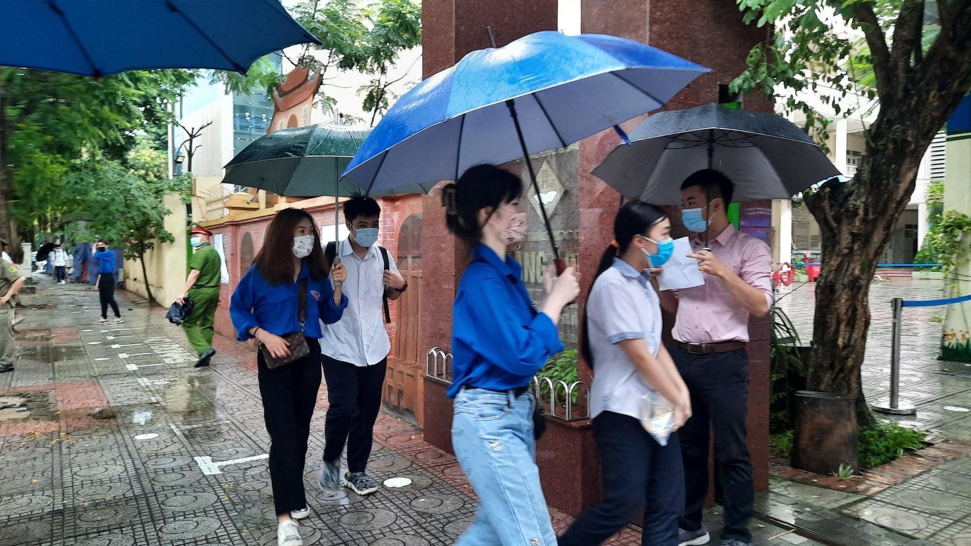 Cô Nguyễn Thị Xuân Yến, phụ huynh học sinh cho biết: "Vì biết là thời tiết không ủng hộ nên tôi và con trai cũng cố gắng đi sớm hơn, cũng chuẩn bị mọi thứ cần thứ cho con như khẩu trang. Tôi thấy công tác phòng dịch của nhà trường rất chu đáo nên tôi cũng yên tâm phần nào. Các cháu tình nguyện viên ở đây chỉ hơn con tôi mấy tuổi thôi nhưng rất nhiệt huyết, không ngại nắng mưa che ô, đo thân nhiệt, sát khuẩn cho thí sinh trước nên tôi thấy rất cảm động, như một động lực tiếp sức cho cả tôi và con".