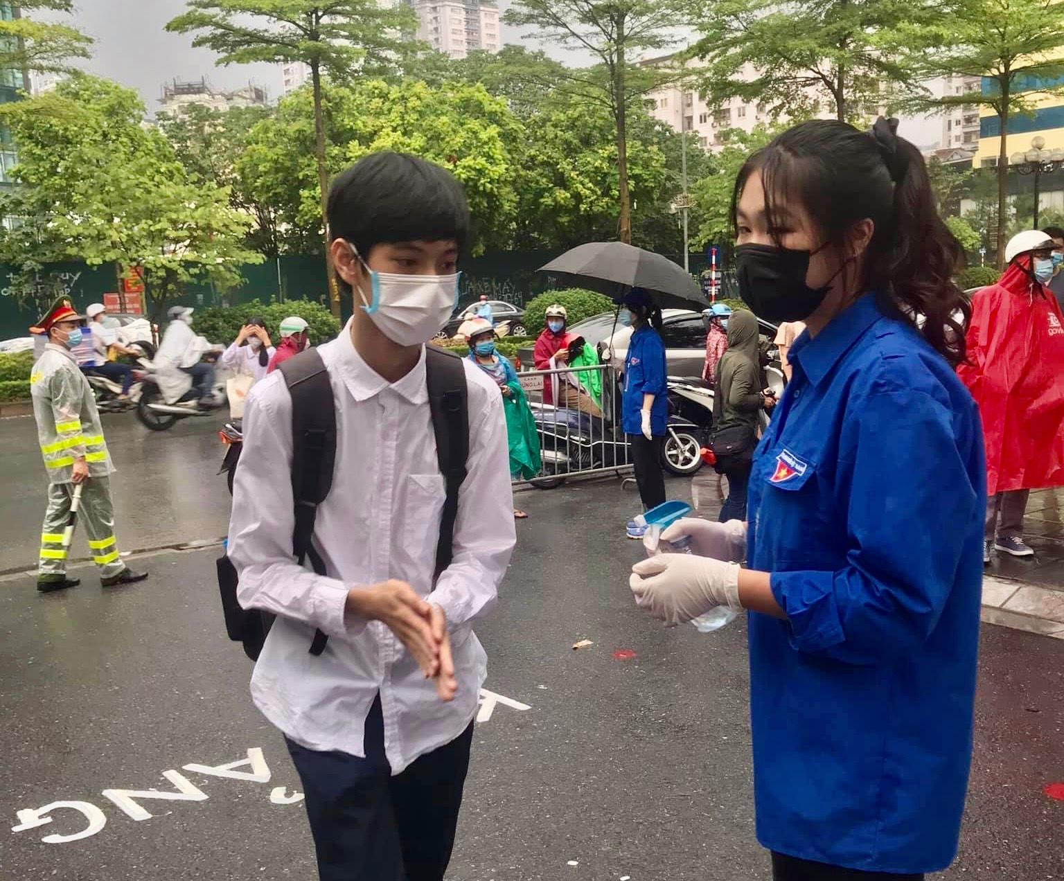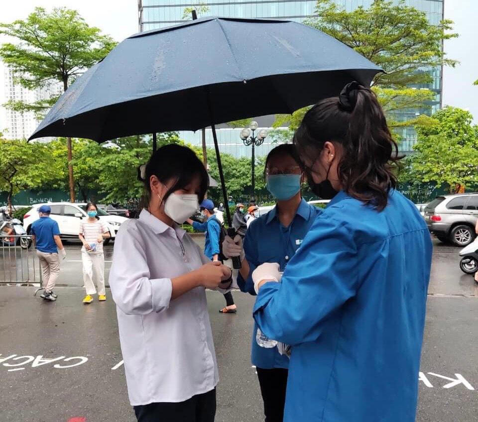 Khoác trên mình màu áo xanh tình nguyện, em Đỗ Hoàng Tú chia sẻ: "Đây là lần thứ 3 em được tham gia hỗ trợ các bạn thí sinh dự thi. Năm nay đặc biệt lắm vì đang làm thời gian cả nước chung tay chống dịch, đường thông thoáng, dù mưa nhưng vì mưa mà không khí mát mẻ. Chúng em đã có mặt từ rất sớm, được trang bị kính chắn giọt bắn, găng tay, khẩu trang và nước rửa tay. Các em học sinh cũng rất ngoan, lễ phép. Em và tất cả các bạn tình nguyện viên đều mong các bạn thi thật tốt và đạt kết quả như mong muốn".