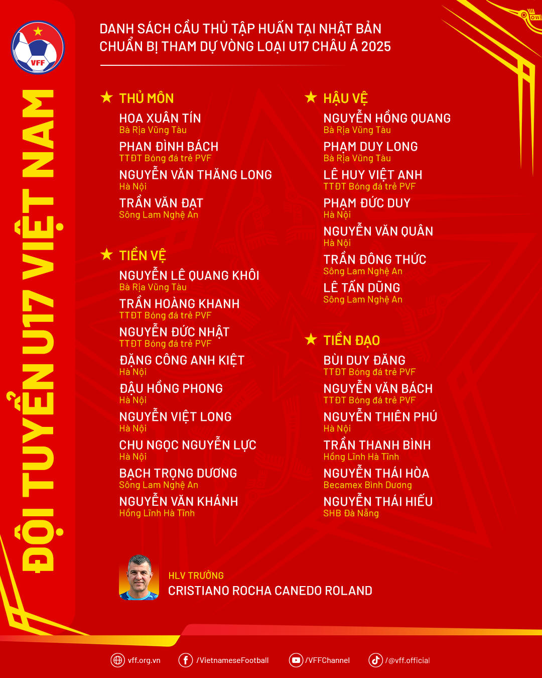 Ở đợt tập trung chuẩn bị cho Vòng loại U17 châu Á 2025, HLV Cristiano Roland cũng đã trao cơ hội cho một số gương mặt mới, trong đó đáng chú ý là cầu thủ Việt kiều Maxwell James Peereboom đang chơi cho đội trẻ Gold Coast Knights thuộc bang Queensland – Australia.