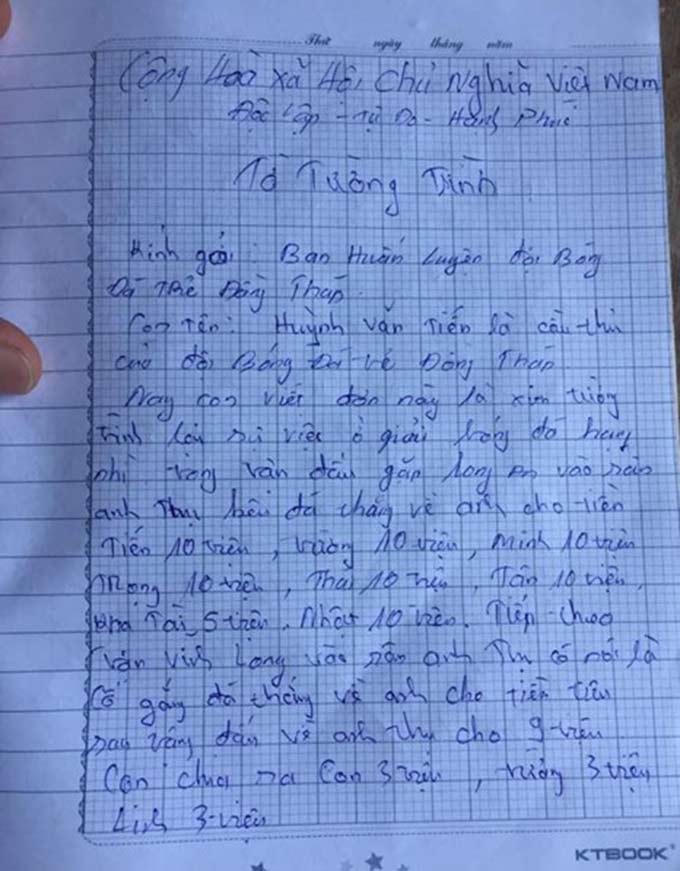 “Sau trận đấu, ăn được 133 triệu. Con chia cho anh em số tiền là: Tiến (Huỳnh Văn Tiến) - 15 triệu; Trường (Nguyễn Nhật Trường) - 13 triệu; Linh (Dương Vũ Linh): 10 triệu; Kha Tài (Kha Tấn Tài): 9 triệu; Huy (Lê Nhựt Huy): 15 triệu; Hoài (Cao Tấn Hoài): 13 triệu; Sô Ny (Giang Sô Ny): 10 triệu; Nghĩa (Trần Hữu Nghĩa): 7 triệu; Trọng (Võ Minh Trọng): 10 triệu; Nhật: 13 triệu; Thái: 3 triệu…”.