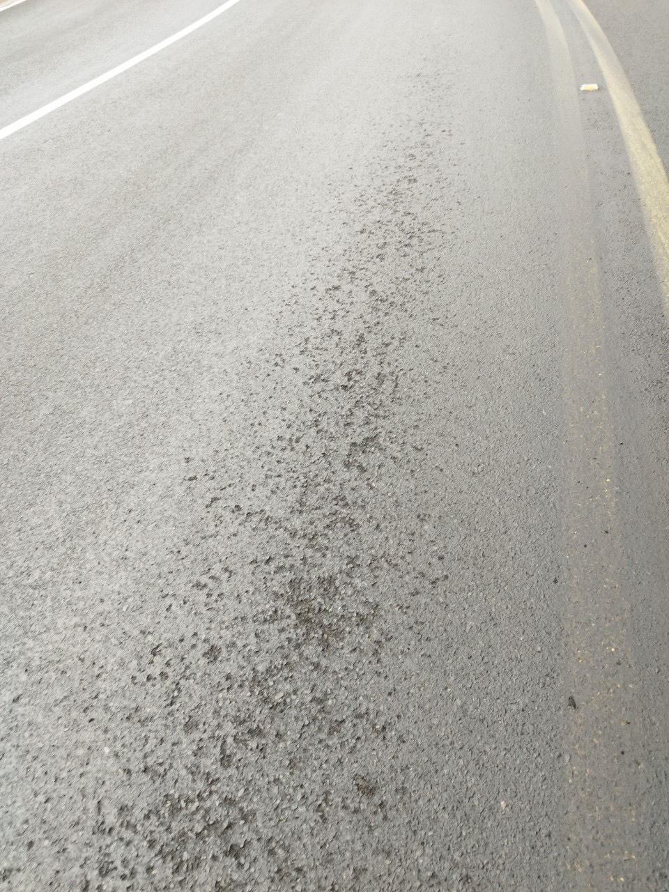 Tổ công tác trực tiếp quan sát, kiểm tra thực tế tại hiện trường ghi nhận tại địa điểm có hư hỏng như phản ánh nằm ở các đoạn đường cong có bán kính nhỏ, độ dốc dọc lớn nên khi các phương tiện xe ô tô tải trọng lớn đi qua các đoạn đường này với vận tốc cao làm một phần dầu từ bình chứa nhiên liệu bị rơi vãi xuống mặt đường. Do số lượng phương tiện lưu thông lớn và tình trạng diễn ra trong thời gian dài làm một số lượng lớn dầu đổ xuống mặt nhựa đường gây bong tróc mặt đường.