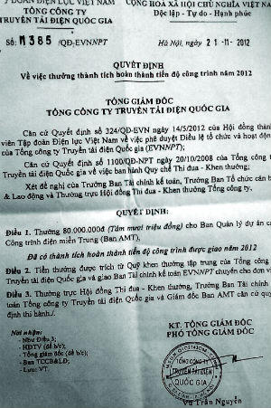 Ngày 21/11/2012, Phó Tổng Giám đốc EVNNPT Vũ Trần Nguyên đã ký hai Quyết định 1374/QĐ-EVNNPT và 1385/QĐ-EVNNPT khen thưởng Ban Giám đốc và Ban Quản lý Dự án các công trình điện miền Trung vì đã hoàn thành một số nội dung công việc trong năm 2012. Văn bản của ông Phó “tổng” Nguyên nêu rõ, hai món tiền thưởng trị giá 120 triệu đồng này được “trích từ Quỹ khen thưởng tập trung của TCty Truyền tải điện Quốc gia và giao Ban Tài chính kế toán của EVNNPT chuyển cho đơn vị”.