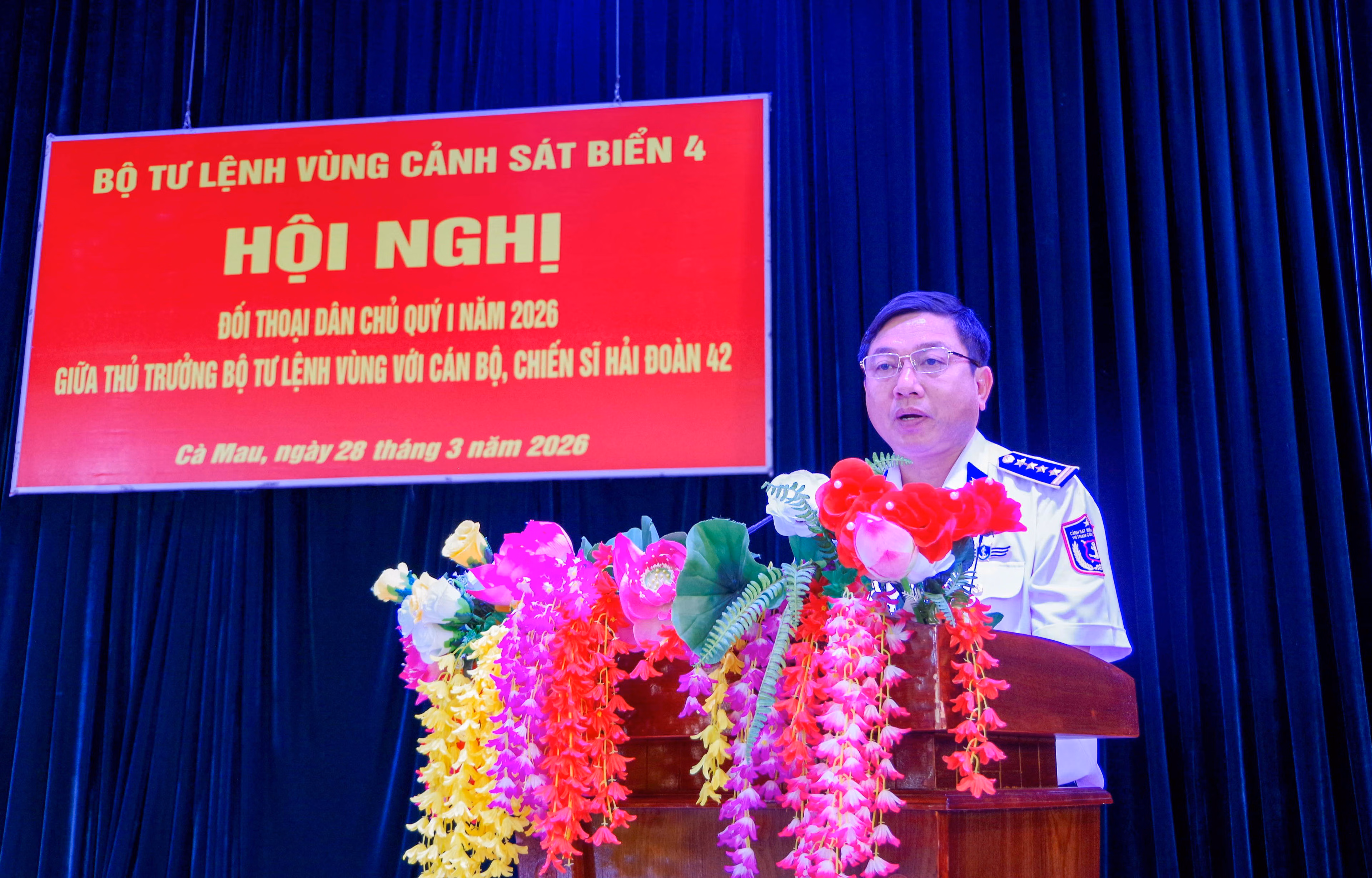Cũng trong dịp này, BTL Vùng Cảnh sát biển 4 đã tổ chức Hội nghị đối thoại dân chủ quý I năm 2026 giữa Thủ trưởng Bộ Tư lệnh Vùng với cán bộ, chiến sĩ Hải đoàn 42. Hội nghị là dịp để thủ trưởng Bộ Tư lệnh Vùng trực tiếp lắng nghe tâm tư, nguyện vọng của cán bộ, chiến sĩ, kịp thời nắm bắt tình hình tư tưởng, những vướng mắc nảy sinh trong quá trình học tập, công tác, sinh hoạt tại đơn vị và hậu phương gia đình.