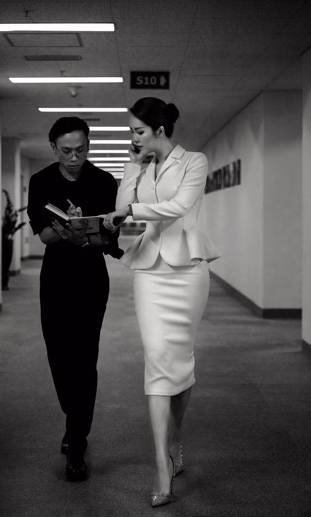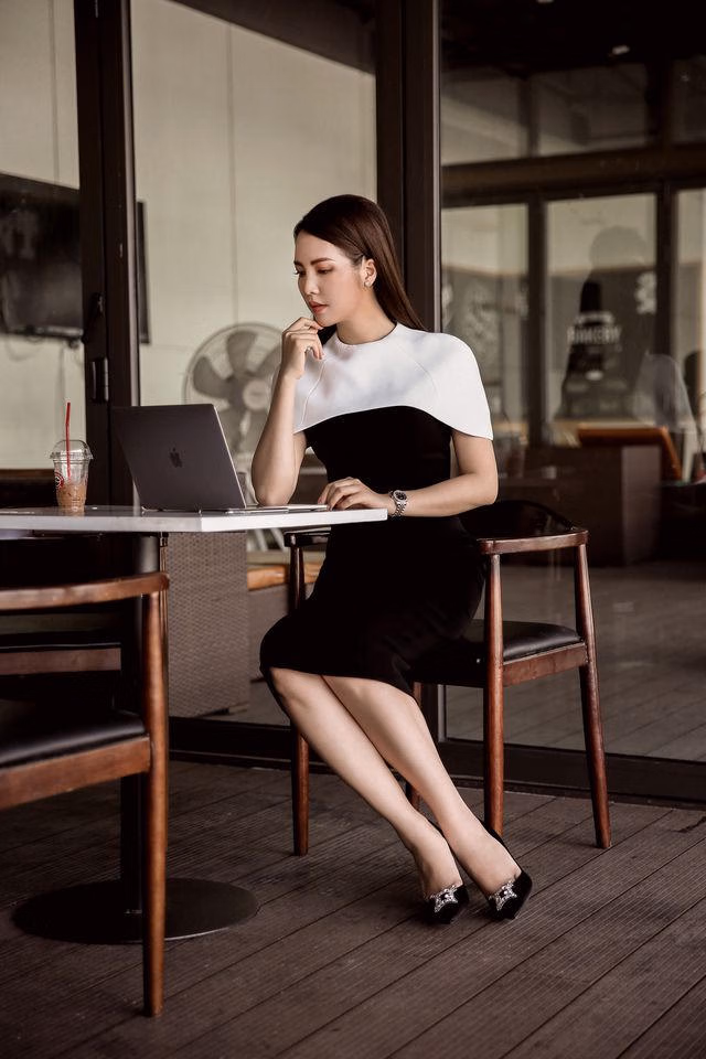 Thuỵ Vân thường chọn trang phục có màu đơn sắc như trắng, đen - trắng...