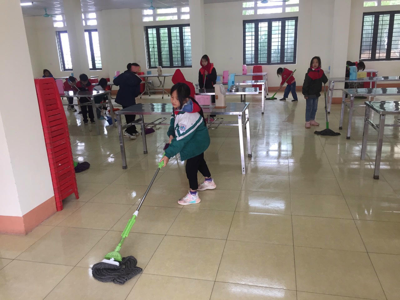Các em tham gia dọn dẹp vệ sinh sau bữa ăn