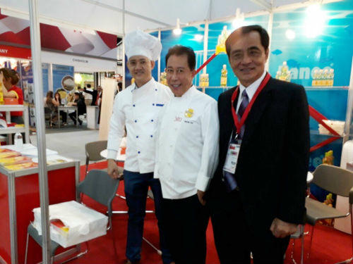 | Ảnh lưu niệm Martin Yan với lãnh đạo Công ty Cổ phần Dầu cá Châu Á tại gian hàng Dầu ăn cao cấp Ranee ở Thai Lan |