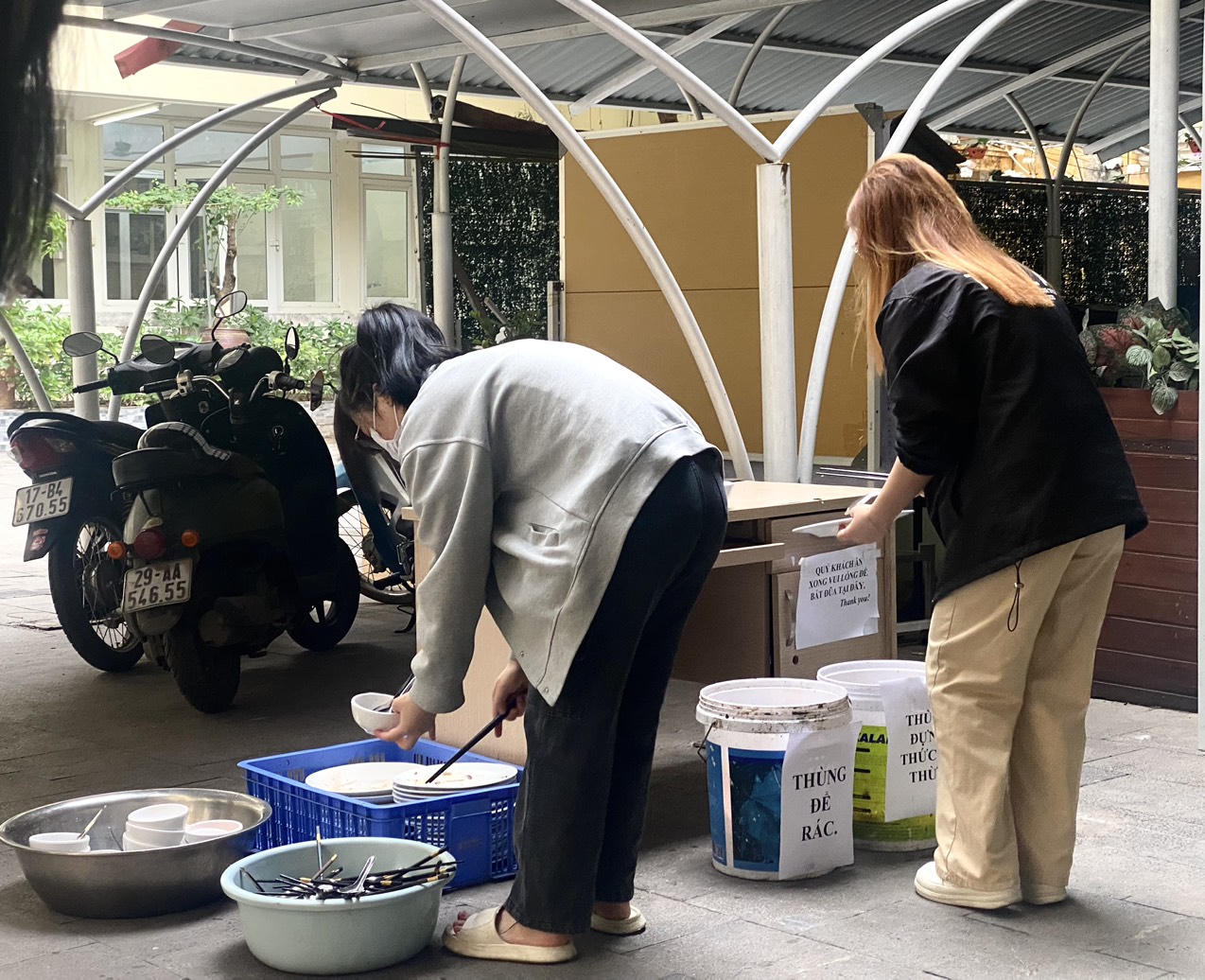 | Khác với những quán ăn khác, tại căng tin này, mỗi khi ăn xong, sinh viên chủ động thu dọn đồ ăn thừa của mình, sau đó phân loại và cho vào thùng rác. |