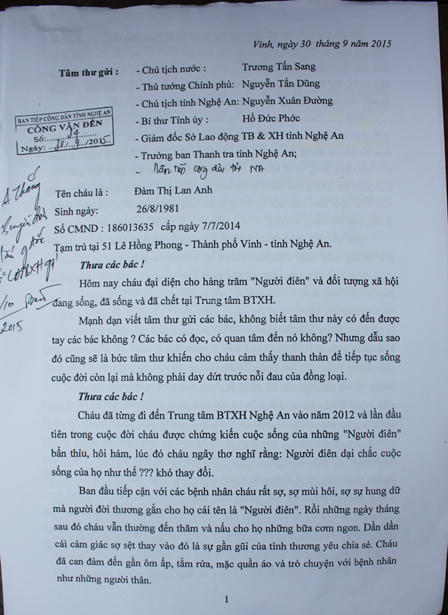 Ngày 30/9, chị Đàm Thị Lan Anh (Fanpage facebook Lan Đàm) có bức tâm gửi các cơ quan chức năng về cuộc sống của những người “điên” tại Trung tâm bảo trợ xã hội Nghệ An. “Thật bất ngờ và sốc khi hình ảnh cơm ba miếng thịt và canh được cháu tận mắt chứng kiến, chân cháu như khụy lại bởi những gì bệnh nhân chia sẻ. Được biết bữa cơm như thế này diễn ra quanh năm mà không thay đổi đó là sự thật.