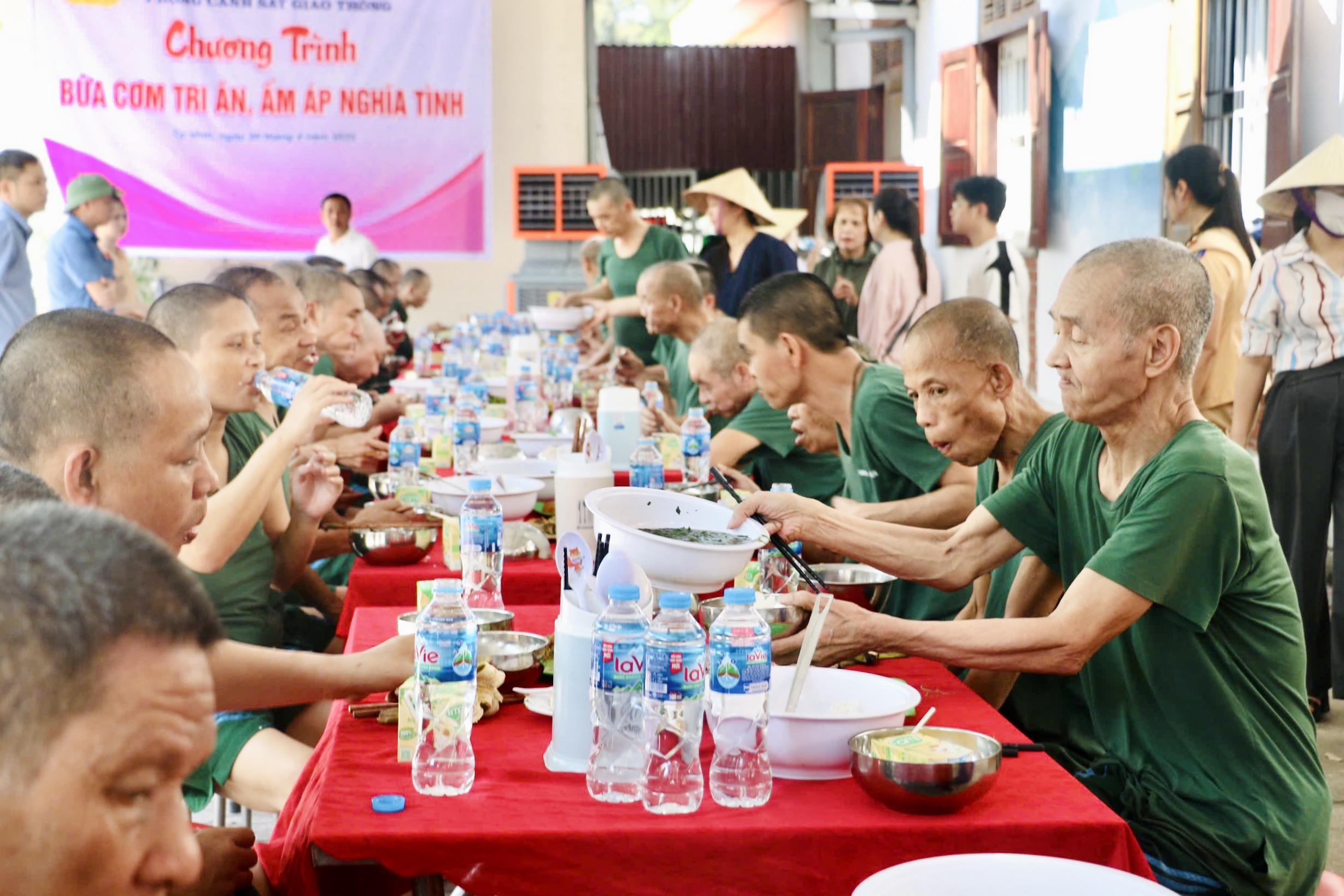 | Bữa cơm thể hiện sự tri ân của các chiến sĩ CSGT (Công an Nghệ An) đối với các bác thương binh tại Khu điều dưỡng thương binh tâm thần kinh Nghệ An. |