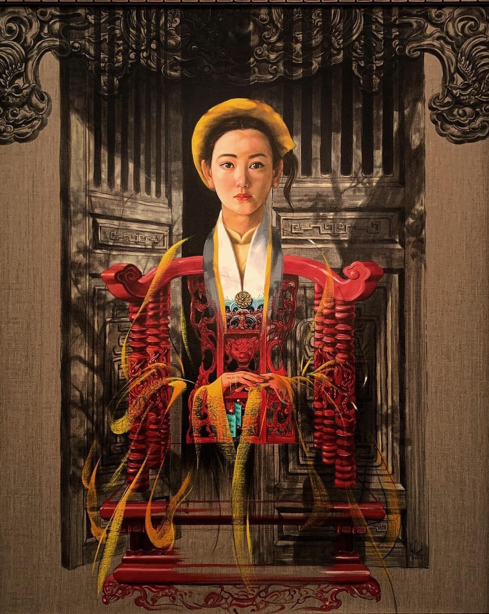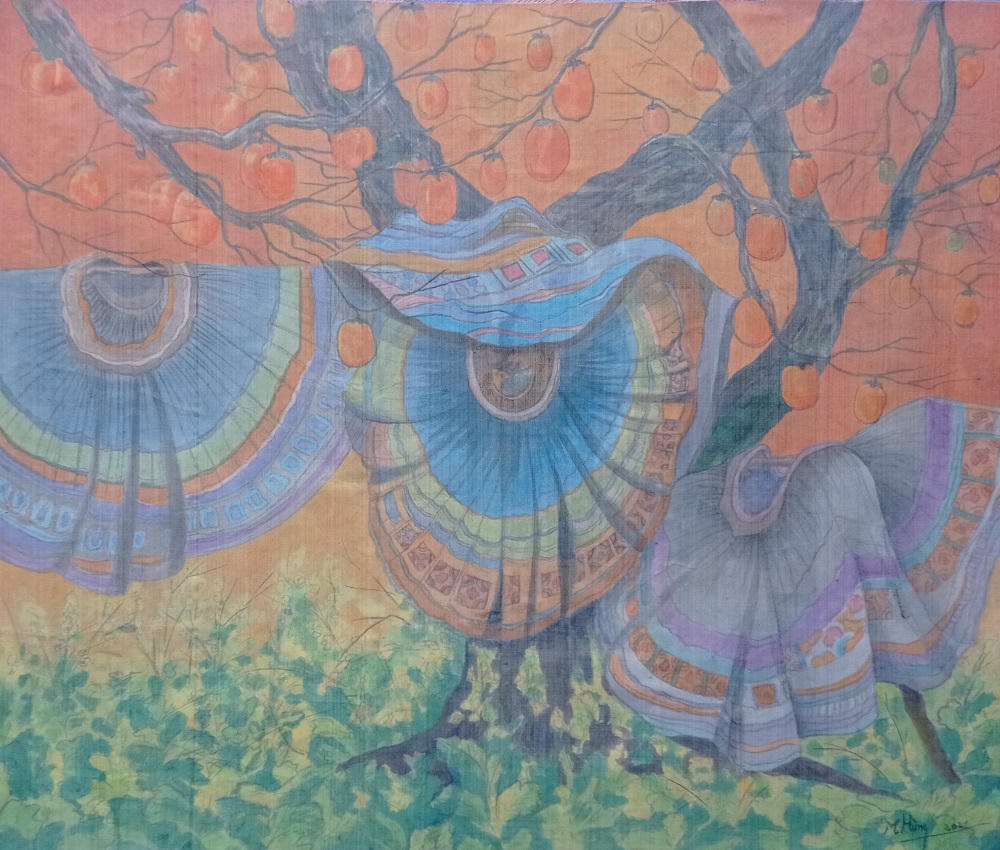 Nếu như hoạ sĩ Lê Văn Minh (sinh năm 1968) gây ấn tượng cho người xem với những mảng màu rực rỡ, bố cục rõ ràng, hài hòa, thì những họa sĩ trẻ như Nguyễn Minh Nam (sinh năm 1978), Hoàng Bá Linh (1990) lại thu hút bằng vẻ đẹp có phần mong manh, hư ảo, hoài cổ của những thiếu nữ với trang phục Cung đình Huế, kỹ thuật vẽ trong - mờ của sơn dầu trên toan.