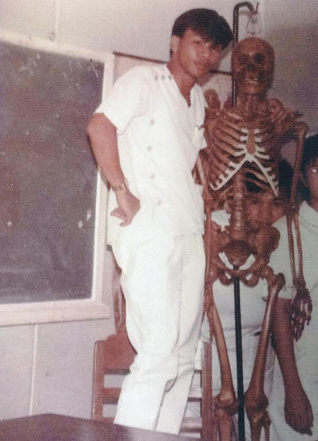 Chua chụp ảnh bên bộ xương người. Ảnh: T.S |