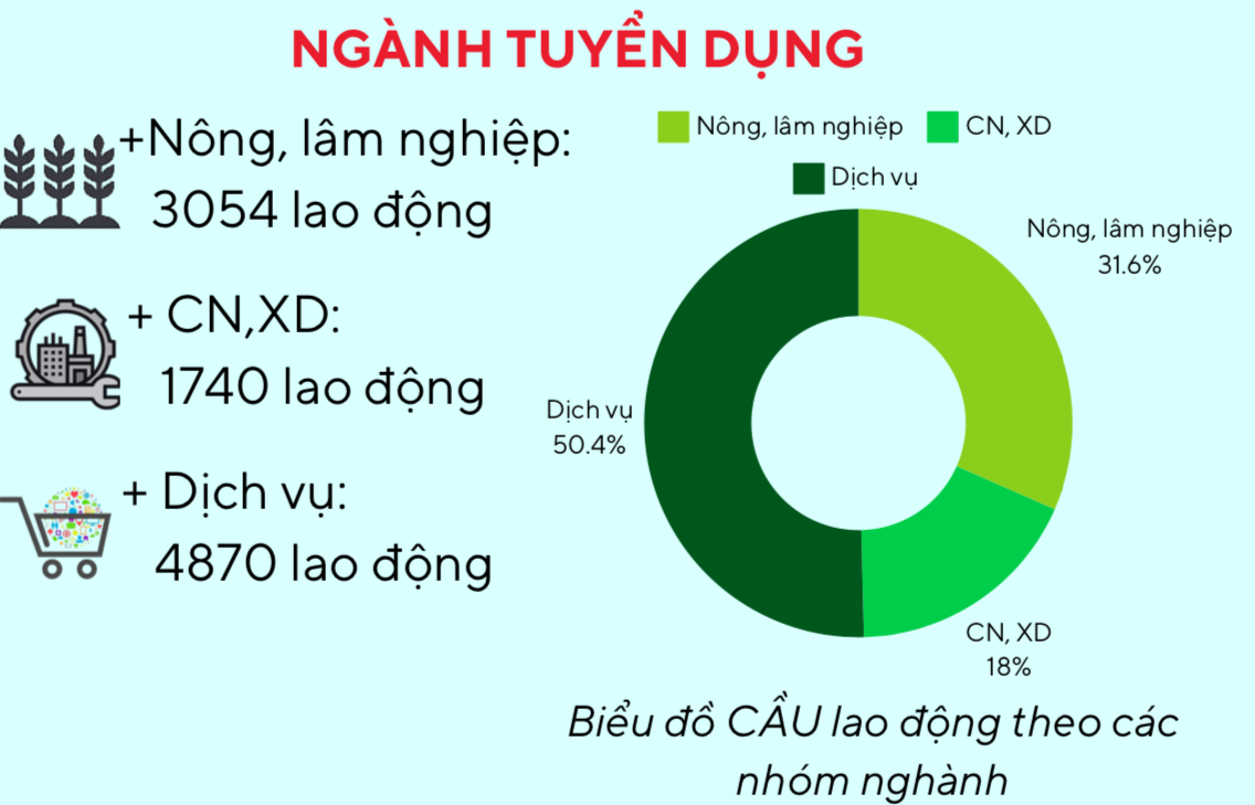 Thứ ba, về ngành nghề tuyển dụng, nhóm dịch vụ chiếm hơn 50% nhu cầu tuyển dụng (4.870 lao động). Trong khi đó nhóm nông, lâm nghiệp là chủ lực của Lâm Đồng chỉ chiếm khoảng 31% nhu cầu tuyển dụng với con số 3.054 lao động.