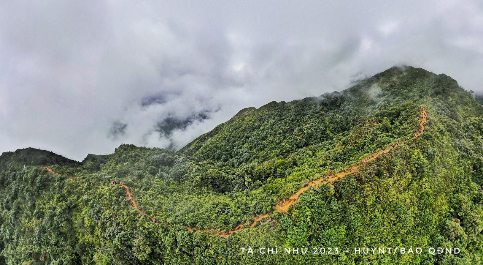 "Bóng áo đỏ của đồng nghiệp mình lẫn trong màu lá xanh, trong cung đường vắt vẻo phía trước" |