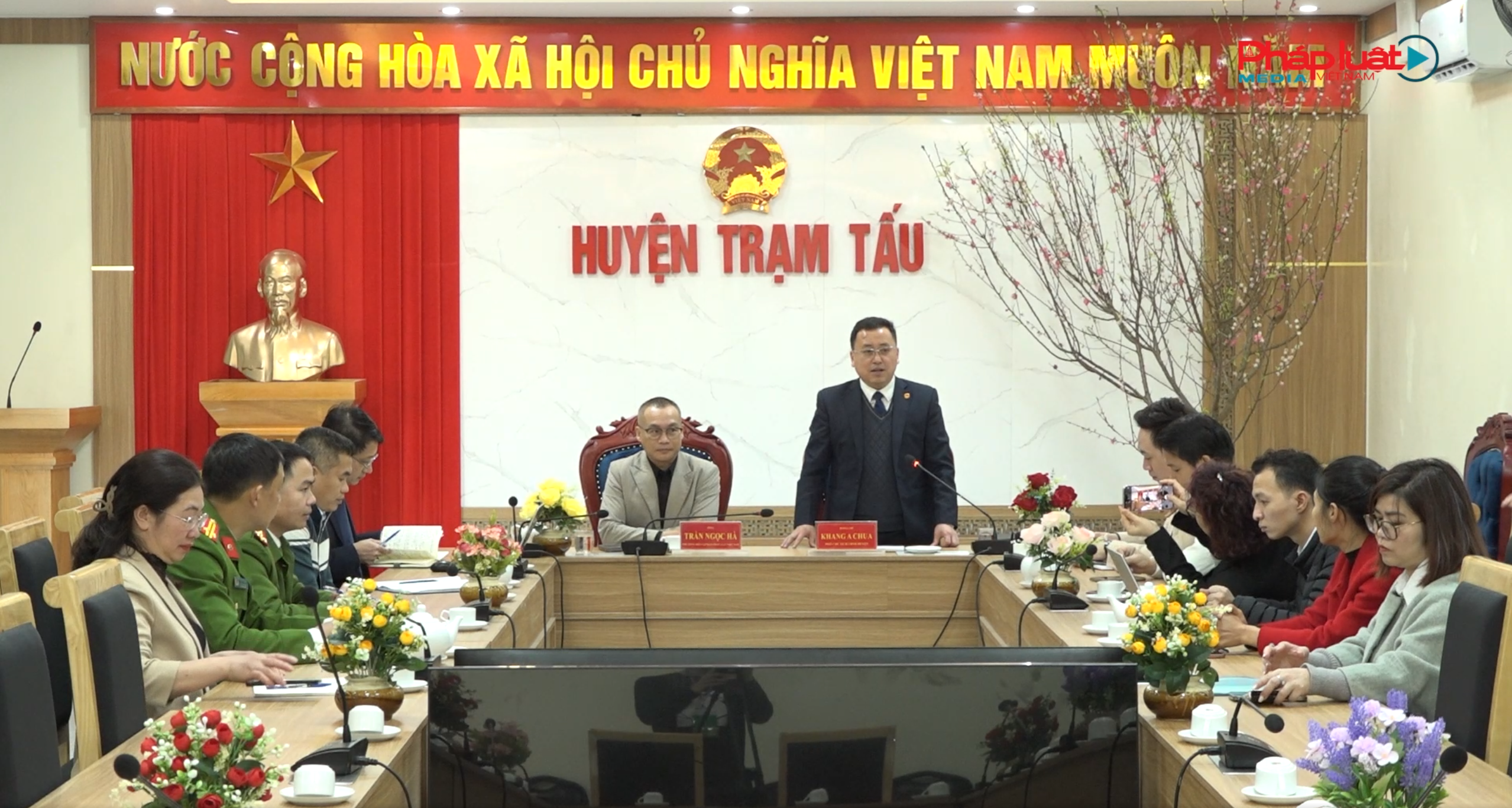 Đồng chí Trần Ngọc Hà – Phó Tổng Biên tập cùng đoàn công tác Báo Pháp luật Việt Nam làm việc với đại diện lãnh đạo UBND huyện Trạm Tấu sáng 15/2. |