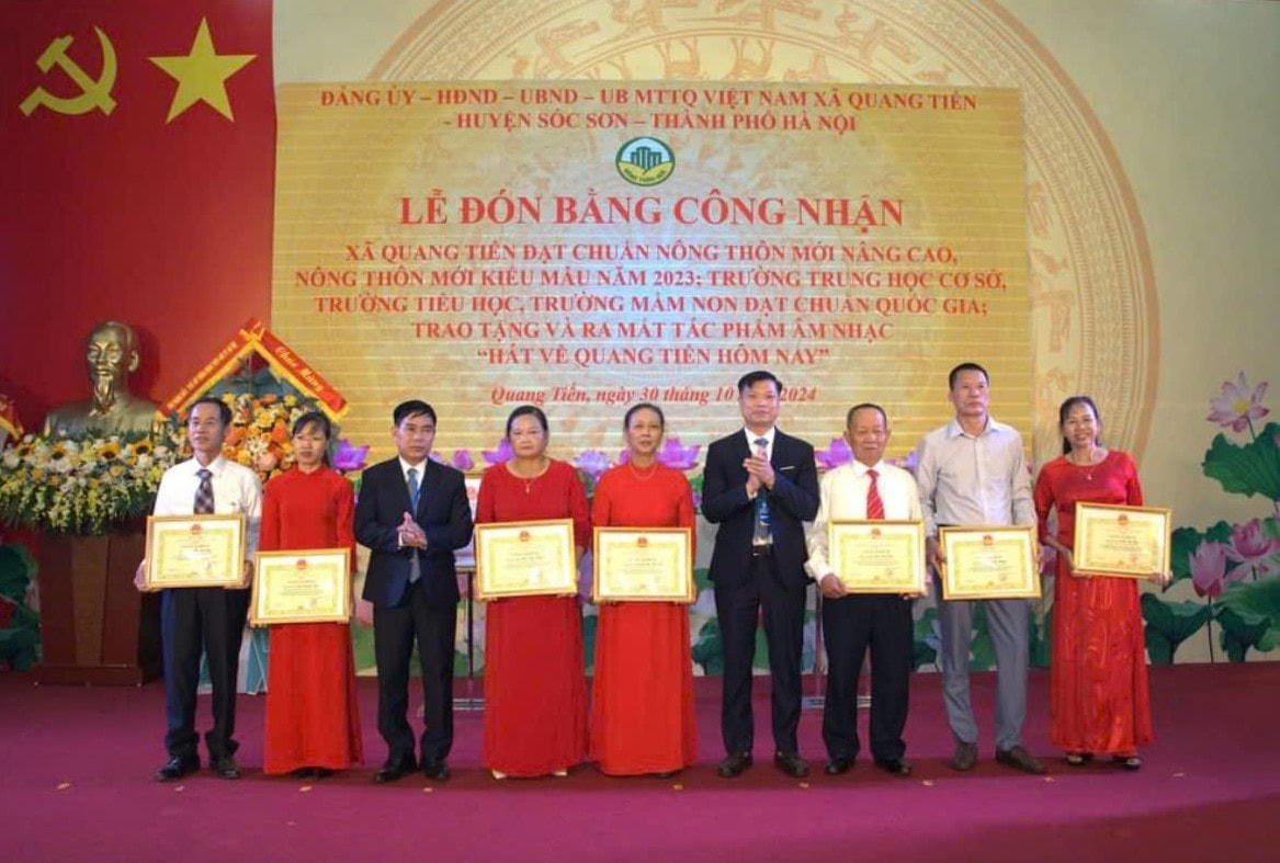 Dịp này, các trường mầm non, tiểu học, trung học cơ sở trên địa bàn xã Quang Tiến cũng được công nhận đạt chuẩn quốc gia; 1 tập thể, 3 cá nhân được Chủ tịch UBND thành phố Hà Nội tặng Bằng khen; 31 tập thể, 66 cá nhân được UBND xã khen thưởng trong phong trào “Toàn dân chung sức xây dựng nông thôn mới”.