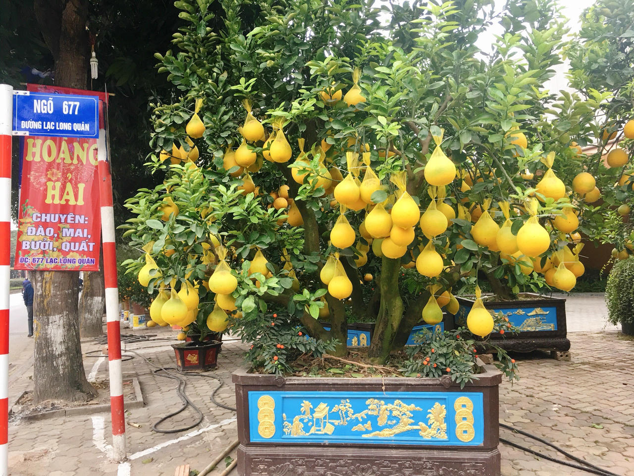 Dọc tuyến phố Lạc Long Quân, những ngày này, nhiều người thích thú khi một số ông chủ nhà vườn đã bắt đầu bày bán những chậu bưởi cảnh trĩu quả phục vụ nhu cầu sắm Tết sớm của người dân.
