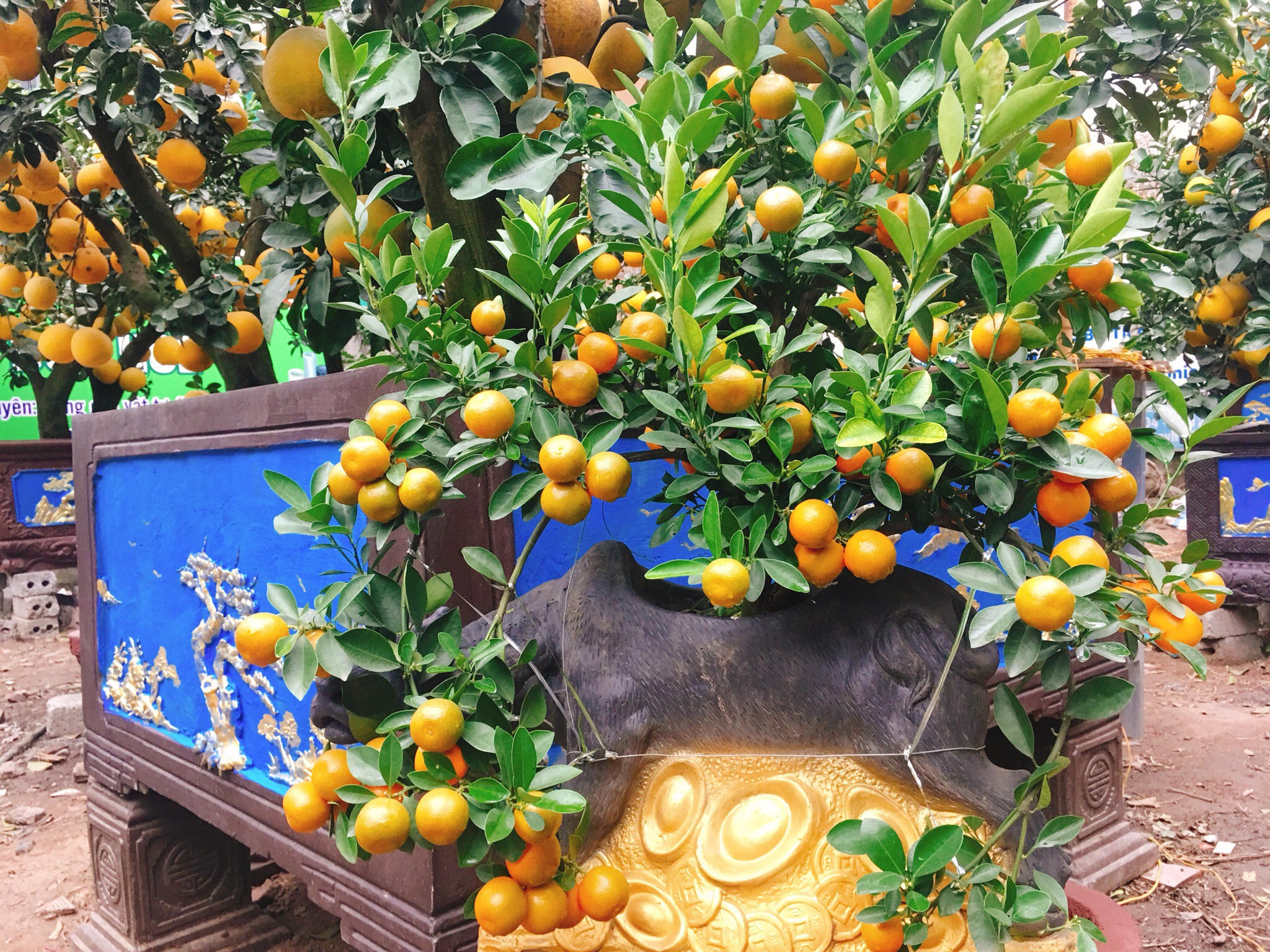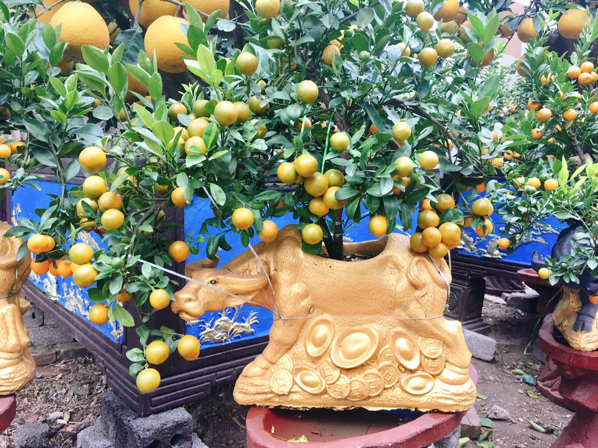 Bên cạnh những chậu bưởi cảnh trĩu quả, anh Thắng – chủ nhà vườn Kim Thắng còn bày bán các loại chậu quất bonsai được các chú trâu vàng còng trên lưng trông vô cùng bắt mắt với giá từ 400.000 đồng/cây cho tới 2 triệu đồng/cây.