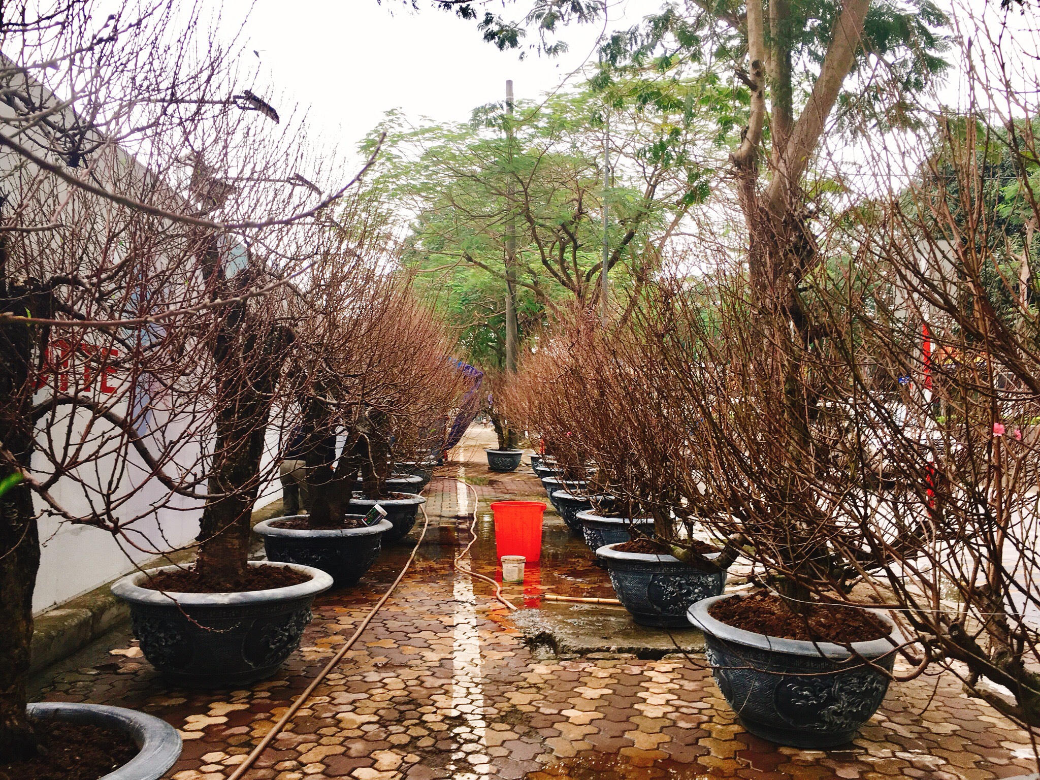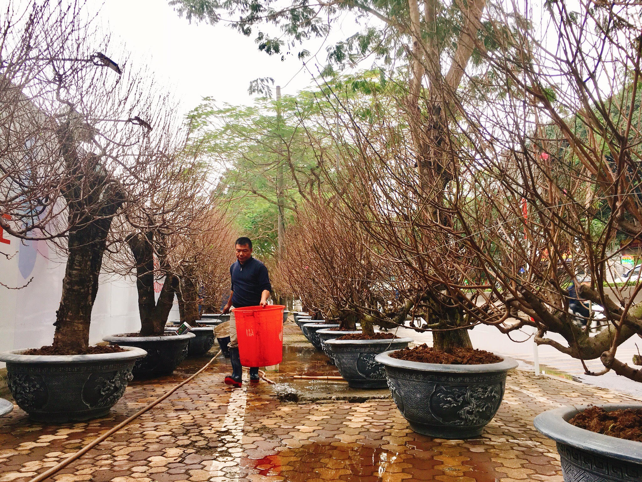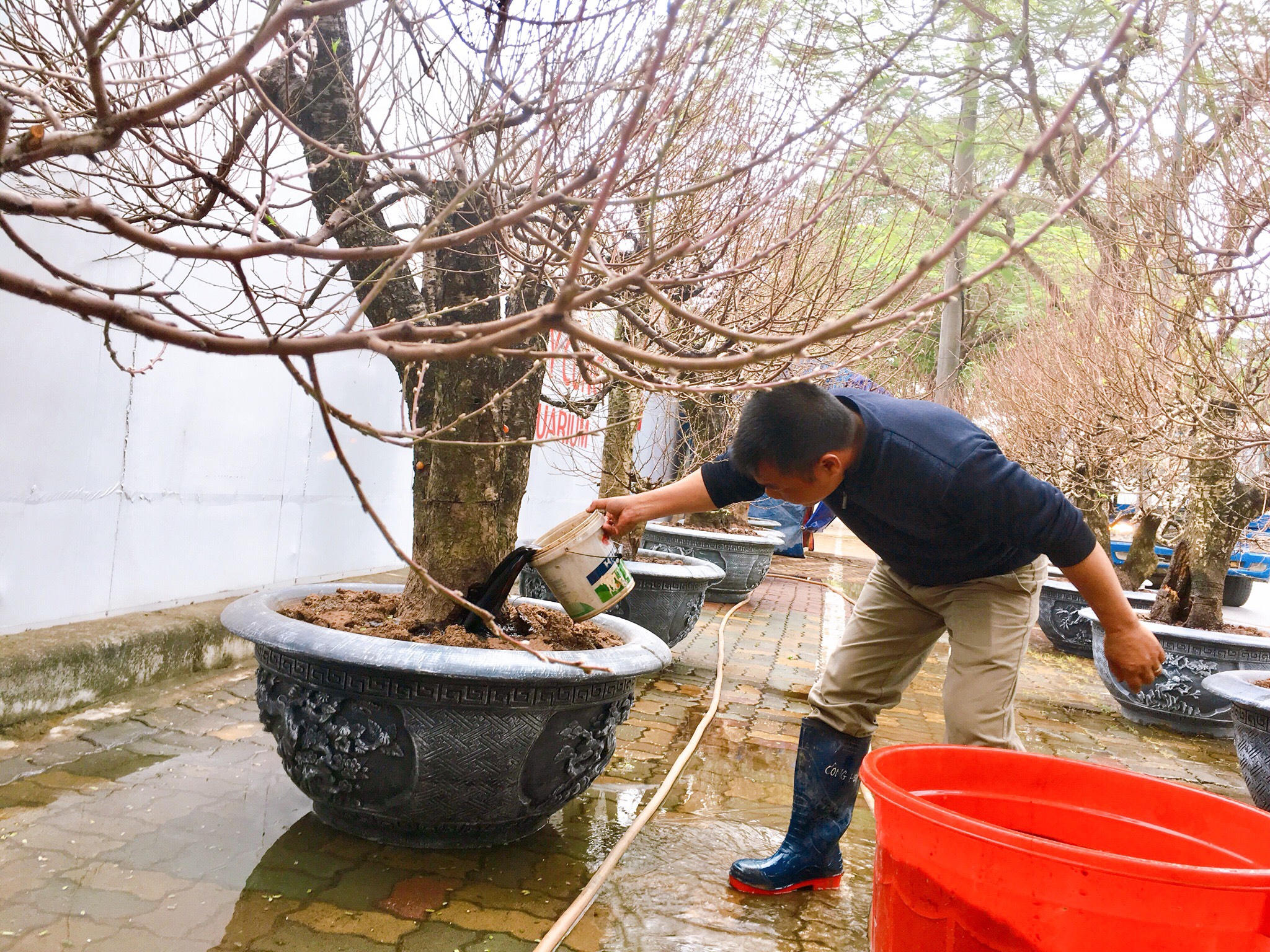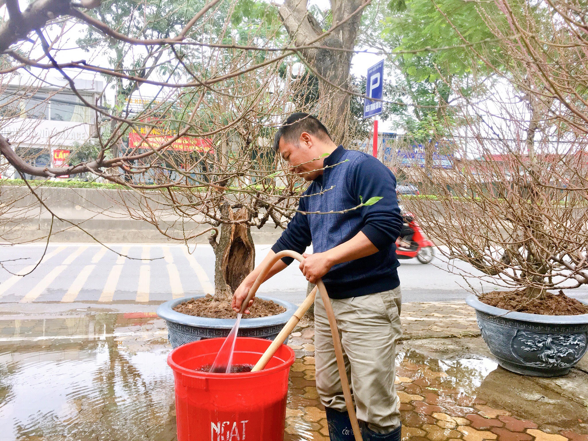 Đang tưới nước, bón phân tổng hợp cho những gốc đào, anh Hoàng Lâm, chủ vườn Hoàng Lâm (Phú Thượng, Hà Nội) cho biết, mặc dù bày bán đào khá sớm nhưng đã có khách tới mua, đặt, đến giáp Tết chừng 20 âm lịch Tết sức mua càng tăng. Khách họ đặt trong nhà hay trang trí cơ quan đều phù hợp. Mỗi dịp tết này anh cũng phải chở nhiều chuyến cây cho khách, đi khắp các tỉnh.