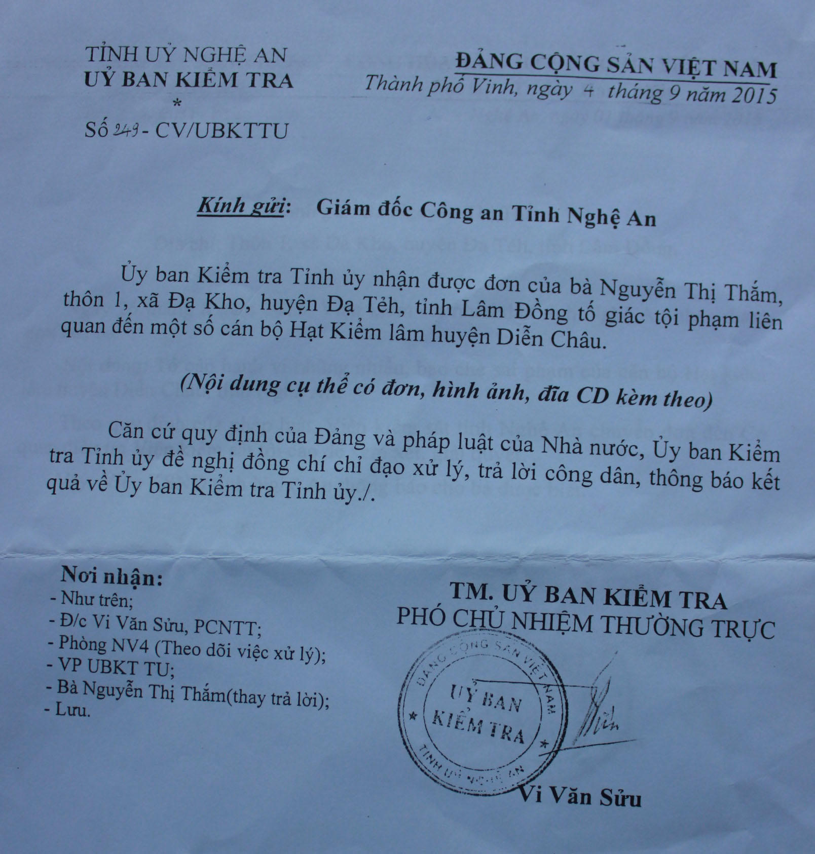 Theo đó, bà Nguyễn Thị Thắm (41 tuổi, trú xã Đạ Kho, Đạ Tẻh, Lâm Đồng) gửi đơn tố cáo đến các cơ quan chức năng trình bày việc, ngày 12/5/2015, bà Thắm mua 500 kg quả mây tại Kiên Giang đưa ra Móng Cái (Quảng Ninh) tiêu thụ. Hàng không bán được nên ngày 19/5/2015, bà thuê xe chở về TP Hồ Chí Minh. Khi tài xế điều khiển xe chạy qua địa bàn huyện Diễn Châu (Nghệ An) thì bị cán bộ Hạt kiểm lâm Diễn Châu kiểm tra, tạm giữ.