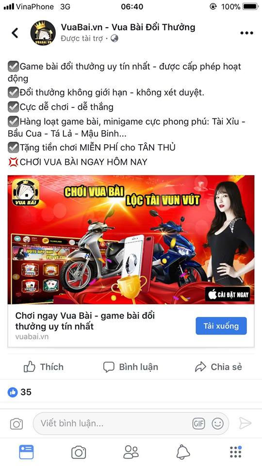 Theo đó, chỉ cần vài phút lướt mạng, vào các trang face book, trong đó hàng đầu là trang “VuaBai.vn - Vua Bài Đổi Thưởng”, sẽ thấy ngay nhà phát triển loại game này đang công khai ngang nhiên tổ chức đánh bạc trên mạng.