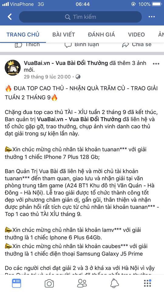 Trang “VuaBai.vn - Vua Bài Đổi Thưởng” luôn đăng tải công khai các quảng cáo, hướng dẫn, tổ chức livestream để thu hút các “con bạc”, đồng thời công khai tổ chức và đăng tải hình ảnh đổi quà trao thưởng (hành vi bị cấm). "Hiện nay, họ công khai tổ chức livestream vào 20h tối thứ 4 và thứ 7 hàng tuần trên fanpage của vuabai.vn" - một người dân phản ánh.