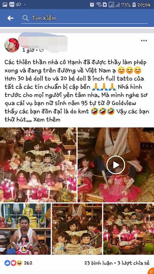 Một nick name Vy H. chia sẻ: “Mình cũng thỉnh một dạng búp bê cỡ 22 inch thuộc dòng phép đen với giá 8 triệu về nuôi nhưng chẳng thấy có gì khác biệt, cũng chẳng nằm mơ thấy gì. Mình nghĩ là họ tâng bốc lên với mục đích làm giàu nhờ sự mê tín của người khác chứ thực sự thì nó chỉ là một con búp bê đồ chơi bình thường, không có bùa phép gì trong đó cả”.