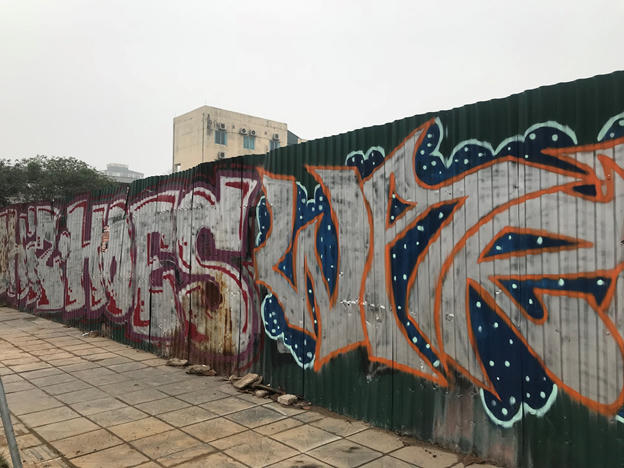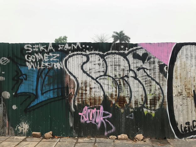 Không dừng lại ở trên tường bê tông ven đê cả mặt trong lẫn mặt ngoài, “bút tặc” còn vẽ lên những bức tường tôn bao chắn các công trình xây dựng. Những hình vẽ phủ kín bề mặt tường tôn, có hình vẽ đã hoàn thiện và có cả những hình vẽ mới chỉ xong phần khung chưa sơn màu.