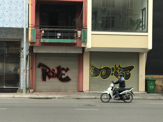 Theo một số người dân sống tại khu vực này, “bút tặc” thường hoạt động về đêm, vẽ khi không có người. “Bút tặc” không chỉ vẽ trên tường bê tông ven đê mà còn vẽ lên hệ thống cửa cuốn, tường bao của nhà dân dọc tuyến đường, gây bức xúc cho người dân.