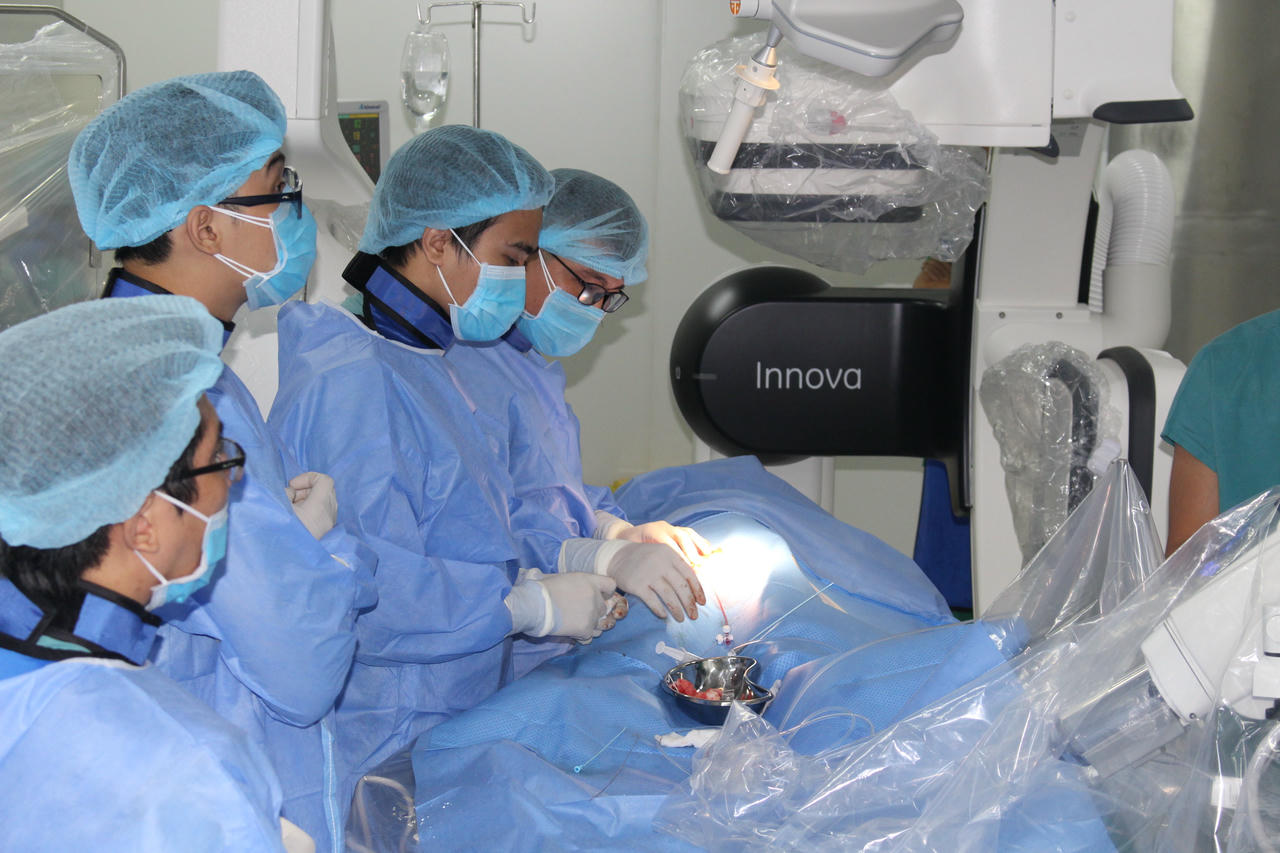 Trong đó, một bé gái 9 tuổi bị còn ống động mạch, một bé 5 tuổi bị thông liên thất. Hai trường hợp can thiệp được thực hiện trên hệ thống chụp mạch máu số hóa xóa nền (DSA) với sự hỗ trợ về chuyên môn của Bệnh viện Nhi đồng 1, TP Hồ Chí Minh.