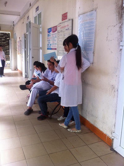 Phòng chị Hương nằm có 6 bệnh nhân, phần lớn đều từ các tuyến tỉnh chuyển lên và trong tình trạng sức khỏe yếu sau phẫu thuật. Vào khoảng 7h30 mỗi ngày, các y tá đẩy xe đi phát thuốc tới từng giường bệnh nhân, các học viên cũng được đi theo thực hành, một ca sẽ có 2 y tá và 2-4 học viên được thực hành “sống” trên người bệnh nhân. Có trường hợp học viên còn được giao thực hiện cả những kỹ thuật chưa… học.