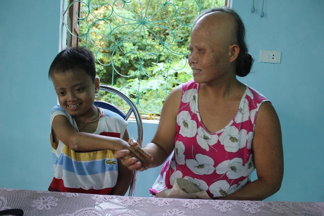 Vợ anh tâm sự, mỗi khi nhìn thấy hình ảnh đứa con nhỏ mặt mũi “chẳng giống ai”, mắt lại cứ mở trừng trừng, còn người chồng, cứ từng chặp phải nhắm mắt một lần chờ cho cơn đau hành hạ vết thương qua mau… khiến chị chán nản vô cùng. Nhưng rồi anh Ôn biết ý, cứ động viên, còn “đặt trách nhiệm” cho chị: “nếu “đi” như thế, đứa con 5 tuổi biết dựa vào ai; đứa nhỏ hơn nữa lớn lên ra sao…”. Dần dà, chị từ bỏ ý định.