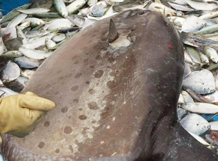 Ngày 7/5, tàu cá do anh Nguyễn Văn Quang (SN 1987, trú tại xã Quỳnh Long, Quỳnh Lưu, Nghệ An) làm thuyền trưởng đang đánh bắt vùng biển Bắc bộ, bất ngờ phát hiện một con cá có kích thước rất lớn vướng vào lưới.