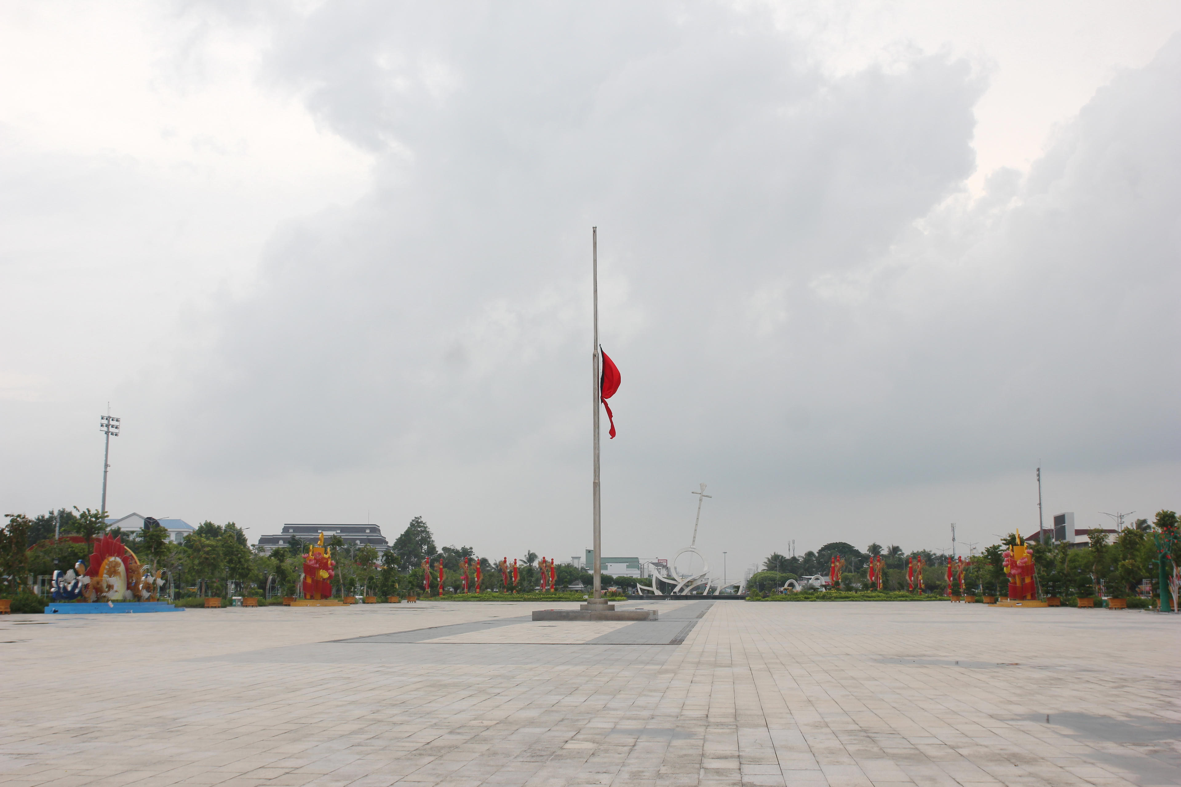 Lá cờ rủ được treo trang nghiêm trên cột cờ lớn tại Quảng trường Hùng Vương (phường 1, TP Bạc Liêu) treo cờ rủ tưởng niệm Tổng Bí thư Nguyễn Phú Trọng. |