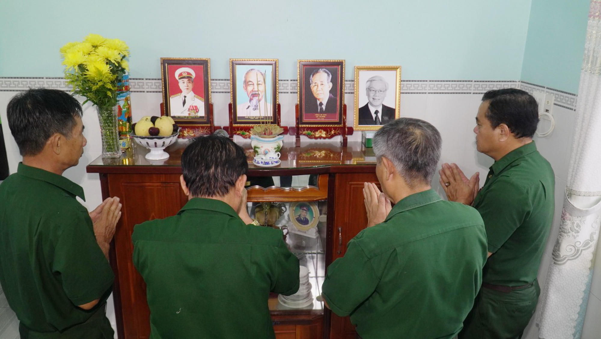 Đại tá Võ Hà Đô (nguyên Trưởng ban Tuyên giáo Hội Cựu chiến binh tỉnh Cà Mau, thứ 2 từ phải sang) cùng các cựu chiến binh phường 9, TP Cà Mau thắp nhang tưởng nhớ Tổng Bí thư Nguyễn Phú Trọng. |