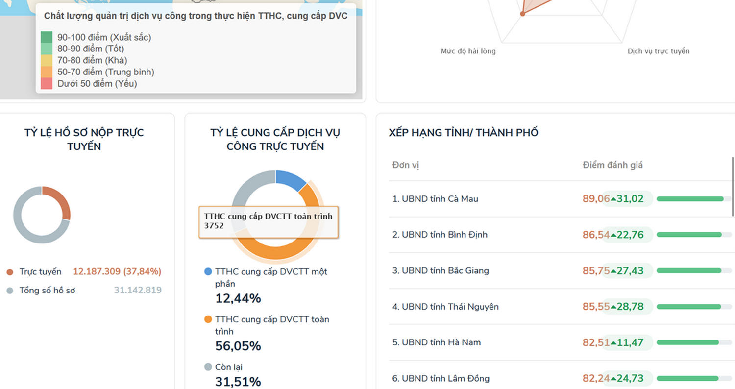 Bên cạnh đó, tỉnh Cà Mau thực hiện việc tích hợp tất cả dịch vụ công trực tuyến lên Cổng Dịch vụ công quốc gia. Năm 2023 tỉ lệ giải quyết hồ sơ qua dịch vụ công trực tuyến của tỉnh đạt 97,3%; tỷ lệ số hóa hồ sơ, kết quả giải quyết thủ tục hành chính của tỉnh đạt 97,29%; tỉ lệ thanh toán trực tuyến đạt 62,58%; năm 2023 đạt 89,06 điểm. Tỉnh Cà Mau đứng đầu cả nước về vị trí xếp hạng theo Bộ chỉ số chỉ đạo, điều hành và đánh giá chất lượng phục vụ người dân, doanh nghiệp trong thực hiện thủ tục hành chính, dịch vụ công theo thời gian thực trên môi trường điện tử.