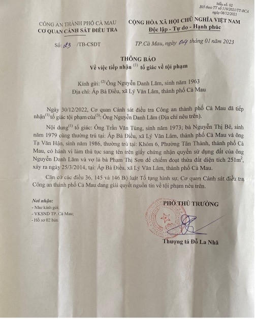 (PLM) - Ngày 4/1/2023 , Cơ quan Cảnh sát điều tra Công an TP Cà Mau (tỉnh Cà Mau) ra Thông báo về việc tiếp nhận tố giác tội phạm do ông Nguyễn Danh Lãm tố giác ông Trần Văn Tùng (SN 1973) và bà Nguyễn Thị Bê (SN 1979, cùng trú tại xã Lý Văn Lâm, TP Cà Mau) ngày 25/3/2014 đã cấu kết với ông Tạ Văn Hận (SN 1986, trú phường Tân Thành, TP Cà Mau) để làm thủ tục sang tên trái phép thửa đất của vợ chồng ông Lãm. Hiện đơn vị đang giải quyết nguồn tin tố giác tội phạm nêu trên.