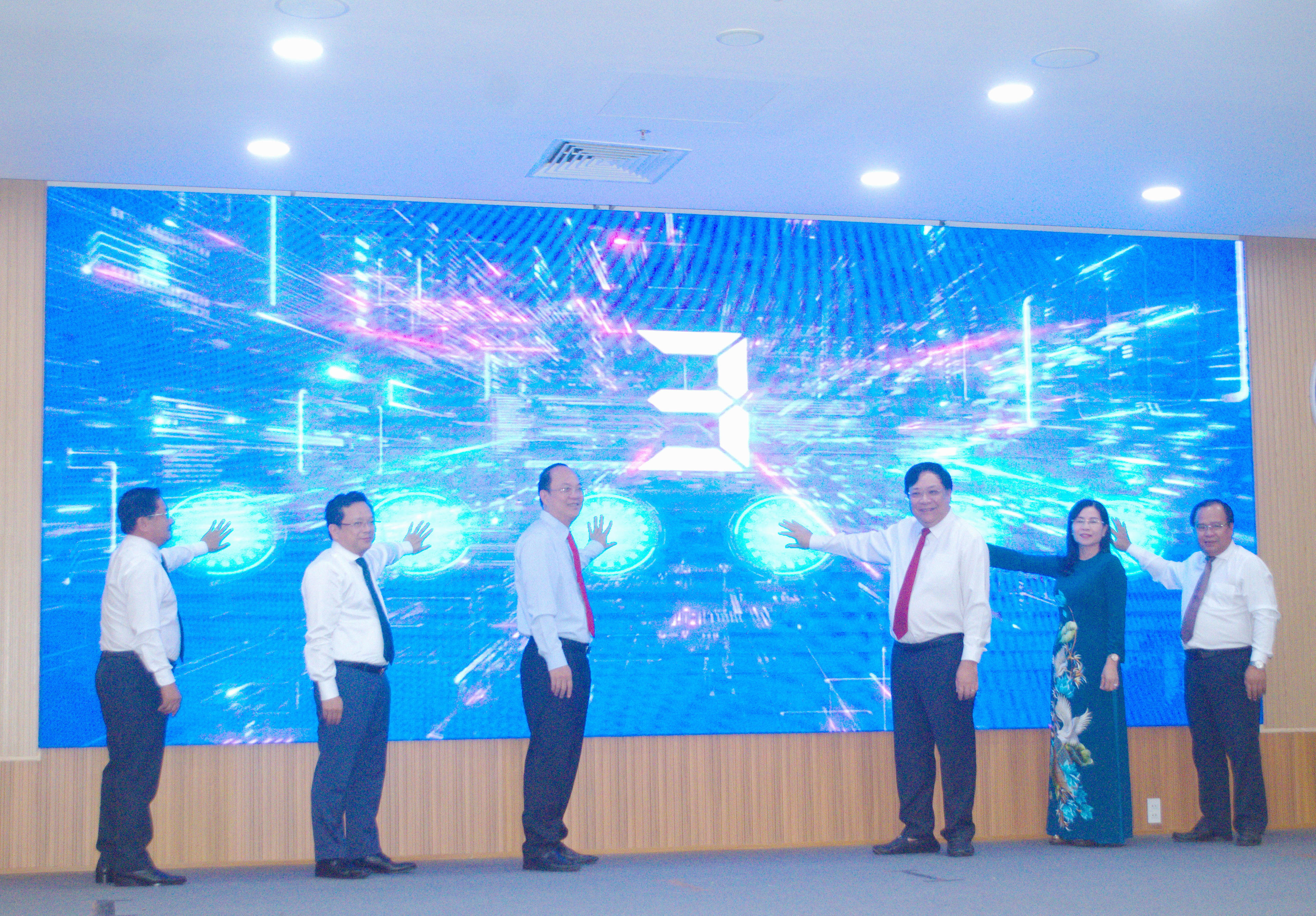 Lãnh đạo tỉnh Cà Mau thực hiện nghi thức bấm nút ra mắt “Nền tảng Bình dân phục vụ số”. |