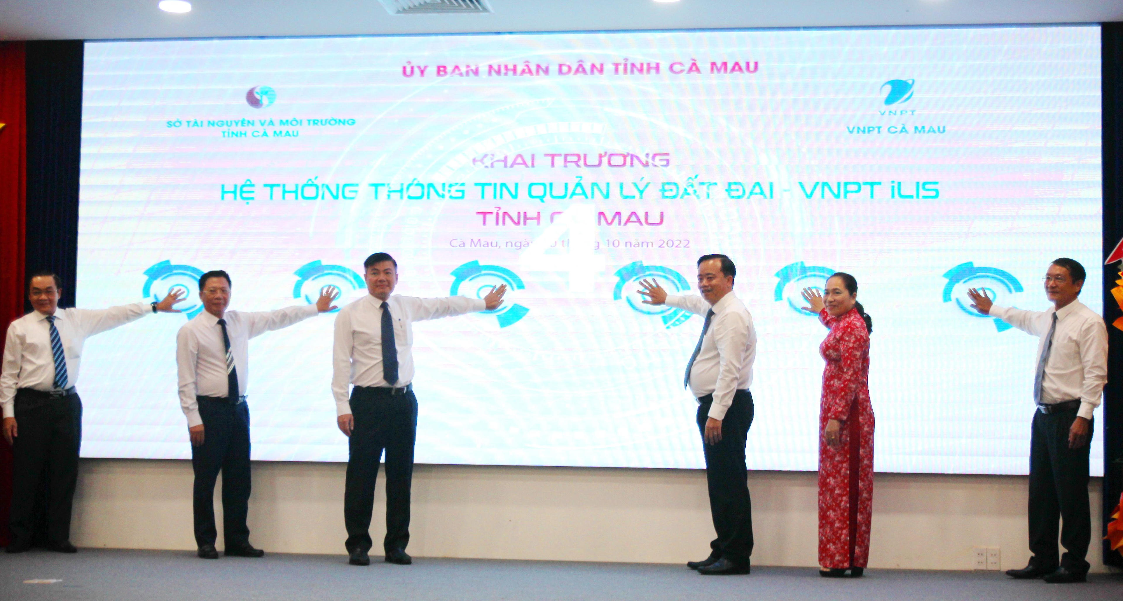 Lãnh đạo tỉnh Cà Mau, lãnh đạo Tập đoàn VNPT nhấn nút khai trương vận hành hệ thống thông tin quản lý đất đai – VNPT Ilis tỉnh Cà Mau. |