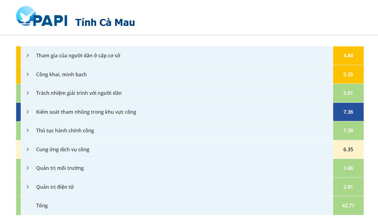 Theo kết quả công bố chỉ số PAPI ở Việt Nam năm 2020, trên cơ sở đánh giá, chấm điểm các nội dung, và thực hiện phân nhóm giữa các tỉnh, thành phố theo bốn nhóm: tỉnh Cà Mau được xếp trong nhóm 2 (nhóm trung bình cao), xếp hạng 31/63 tỉnh, thành phố trực thuộc trung ương (năm 2019, tỉnh Cà Mau thuộc nhóm trung bình thấp).