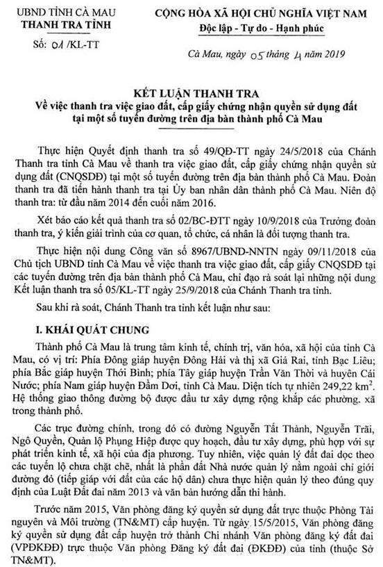 Sau khi tiến hành rà soát, xác minh, bổ sung thời điểm sai phạm, từ năm 2014- 2018, Thanh tra tỉnh Cà Mau đã ban hành Kết luận Thanh tra số 01 vào ngày 05/4/2019, đã chỉ rõ các sai phạm trong việc quản lý, sử dụng phần đất ngoài chỉ giới đường đỏ dọc theo 5 tuyến đường, gồm: Quảng lộ Phụng Hiệp, Hải Thượng Lãn Ông, Ngô Quyền, Nguyễn Trãi và Nguyễn Tất Thành của nhiều cơ quan, cá nhân trực thuộc UBND tỉnh Cà Mau.