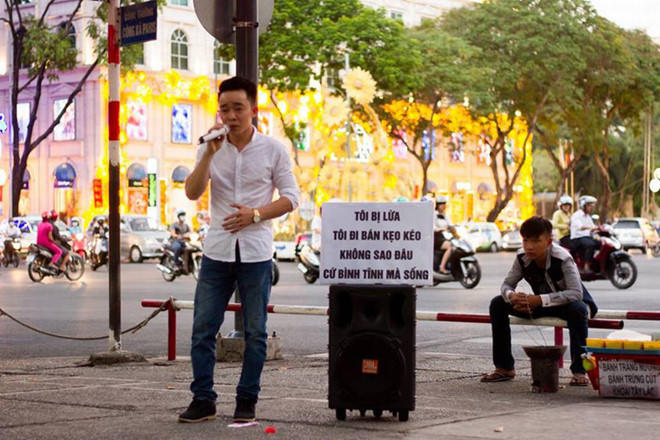 Lê Cường khi đi hát rong từng đem theo một tấm bảng hiệu có dòng chữ: “Tôi bị lừa. Tôi đi bán kẹo kéo, không sao đâu. Cứ bình tĩnh mà sống”. Ngay lập tức, hành động của chàng trai này thu hút sự chú ý của mọi người và nhận được nhiều sự quan tâm.