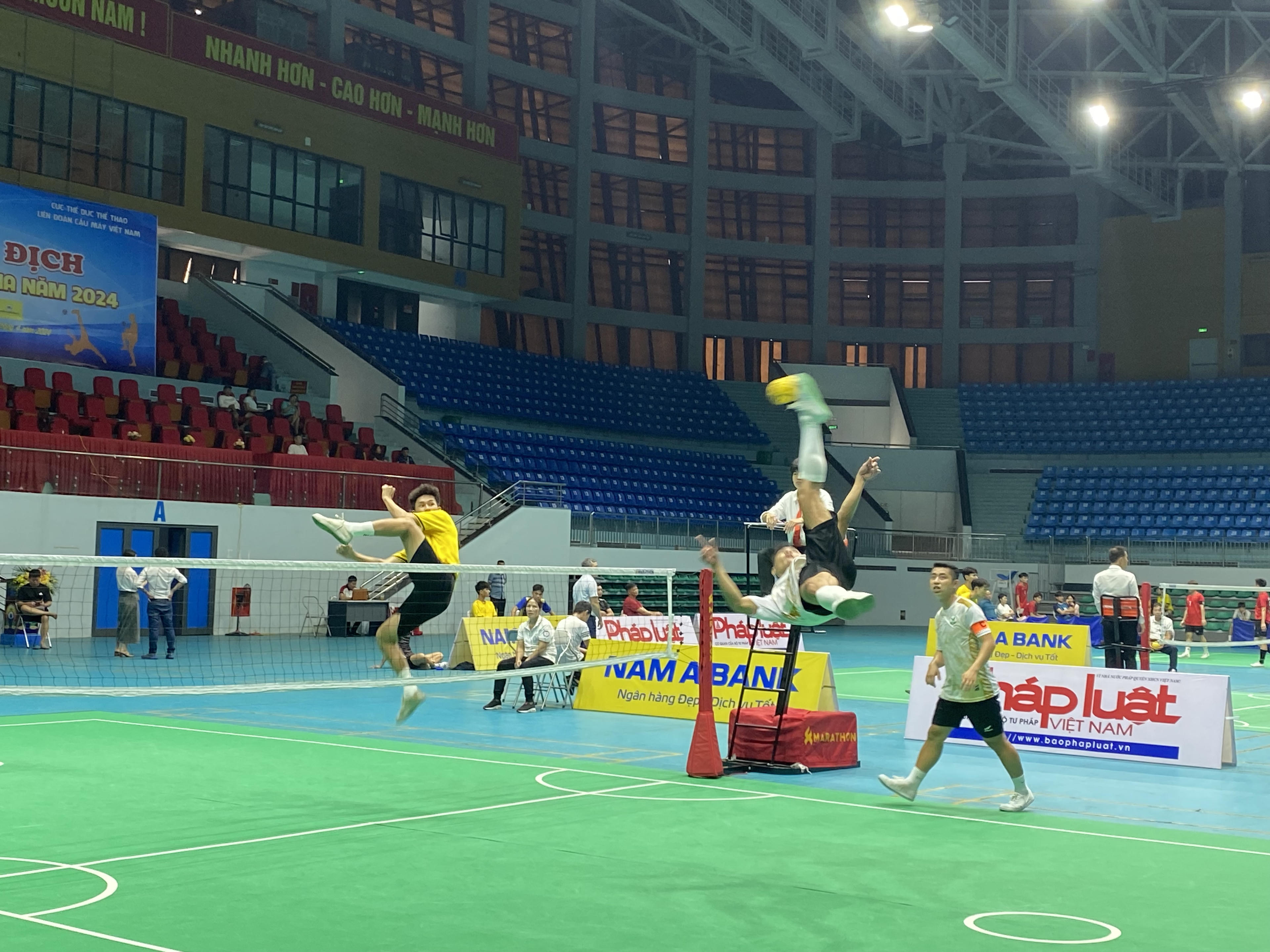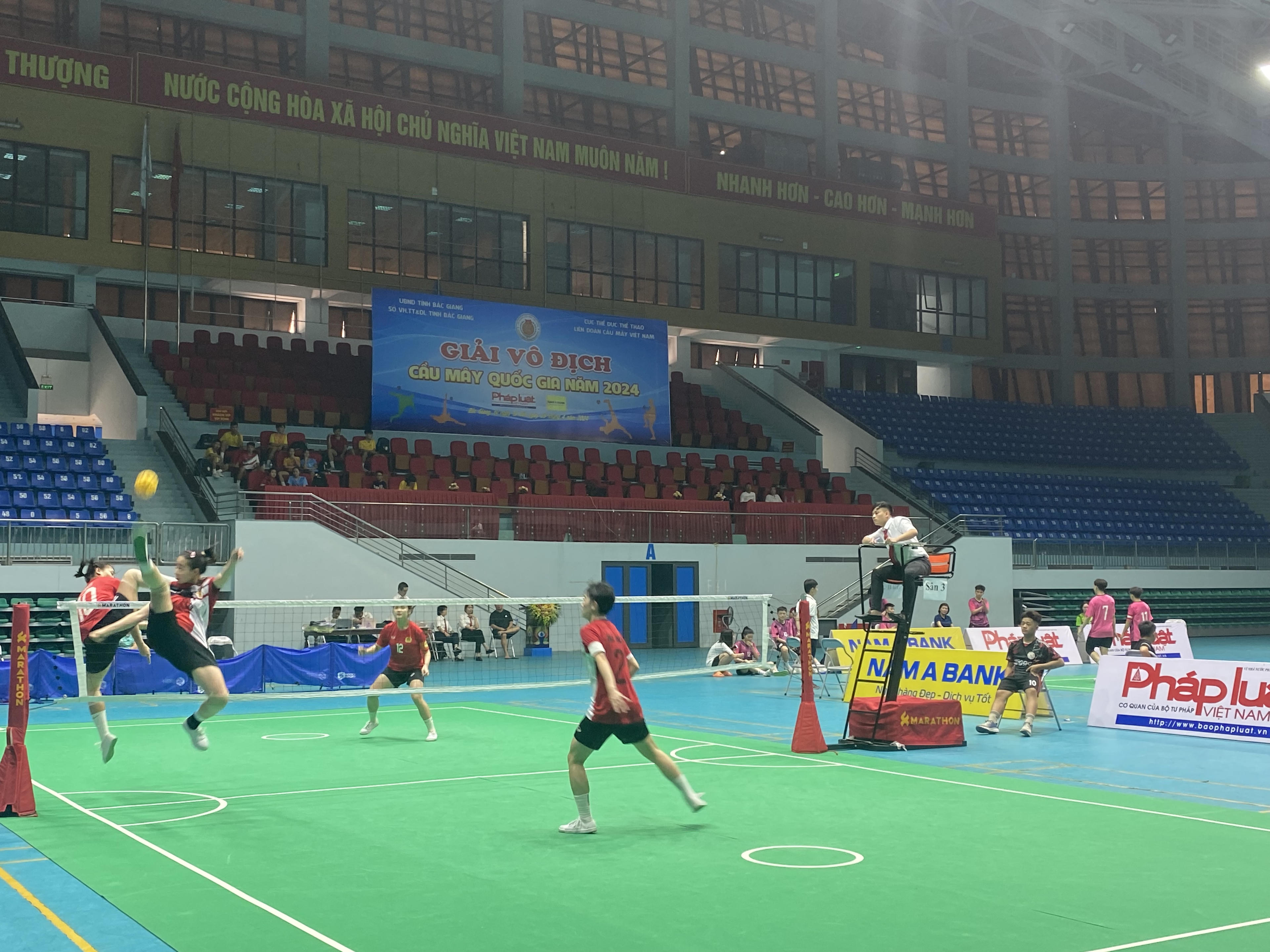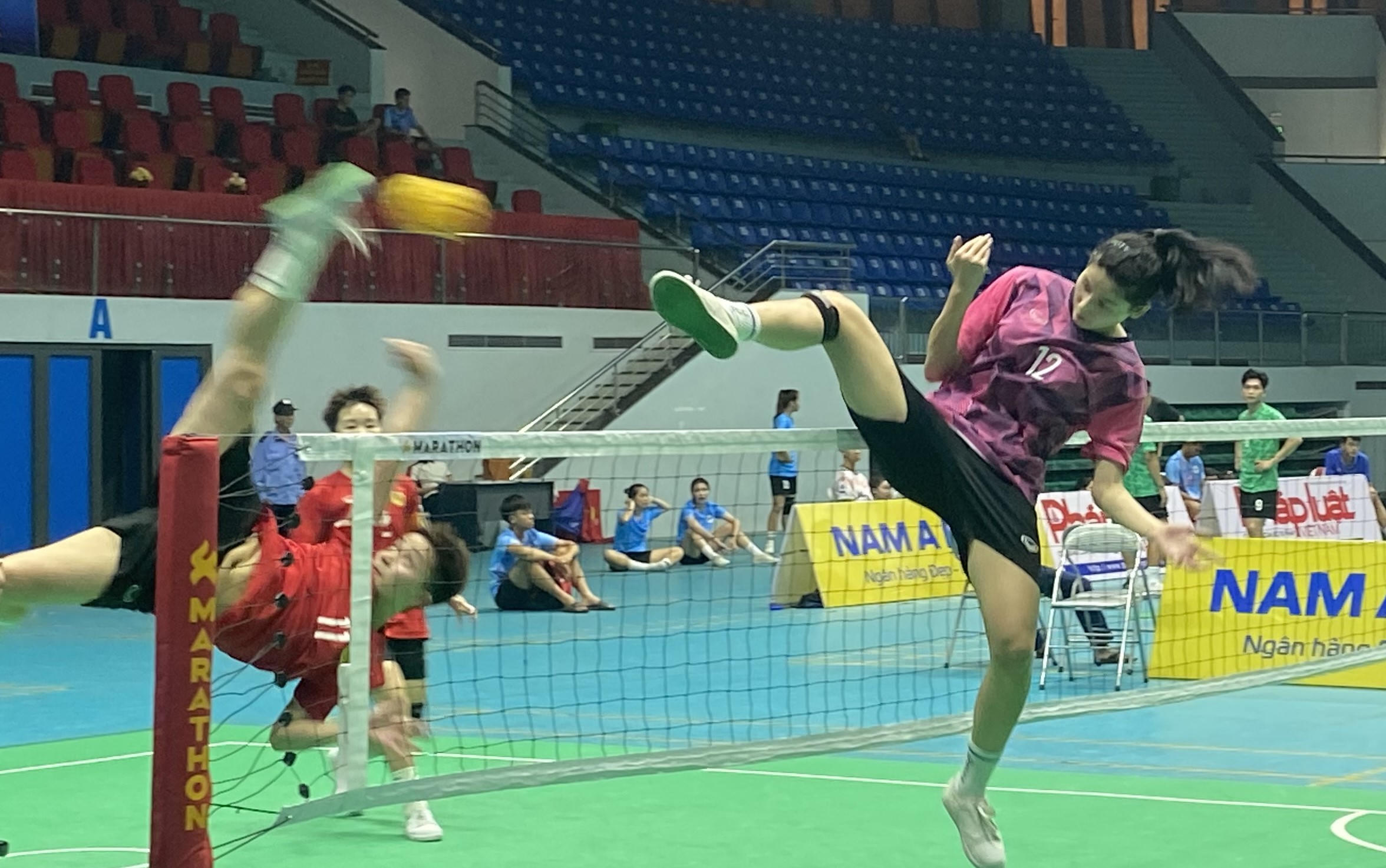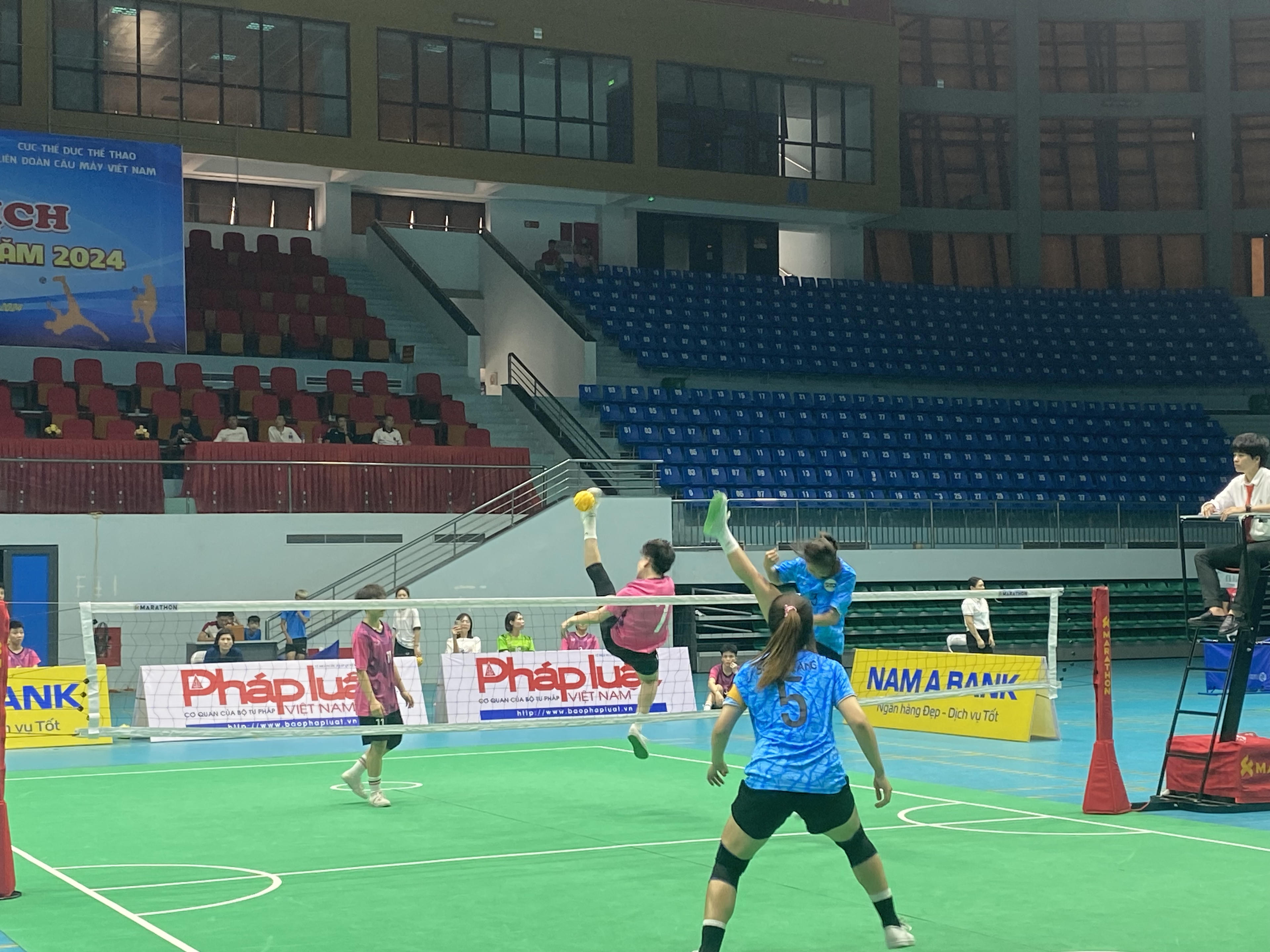 Ảnh pha không chiến bán kết đội tuyển đôi nữ giữa Sóc Trăng (áo xanh) và Nghệ An (áo hồng) |