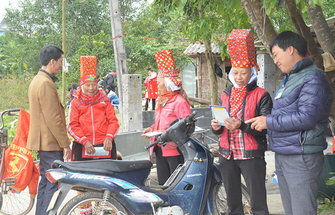 | Cán bộ tư pháp xã Quảng Lâm và huyện Đầm Hà, Quảng Ninh phát tờ rơi tuyên truyền pháp luật cho người dân tộc. |