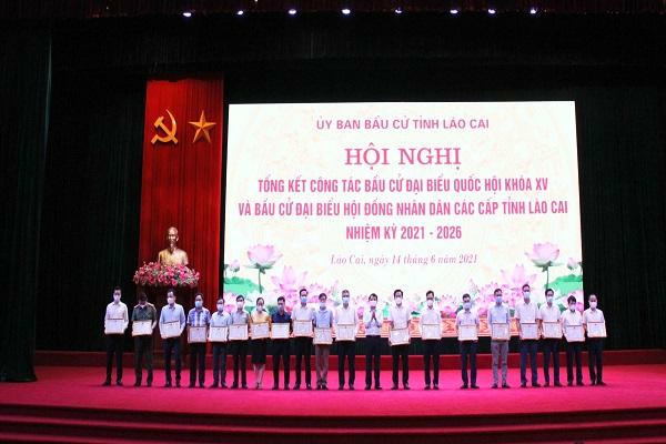 Cũng tại hội nghị, tỉnh Lào Cai đã trao tặng bằng khen Chủ tịch UBND tỉnh Lào Cai cho 31 tập thể, 63 cá nhân có thành tích xuất trong công tác bầu cử Đại biểu Quốc hội khóa XV và đại biểu HĐND các cấp, nhiệm kỳ 2021-2026; trao giải cho 3 cá nhân đoạt giải tại cuộc thi trực tuyến “Tìm hiểu pháp luật về bầu cử đại biểu Quốc hội và đại biểu HĐND"; trao tặng bằng khen của Bộ trưởng Bộ Tư pháp cho Sở Tư pháp tỉnh Lào Cai có thành tích xuất sắc trong cuộc thi “tìm hiểu pháp luật về bầu cử đại biểu Quốc hội và đại biểu HĐND”.