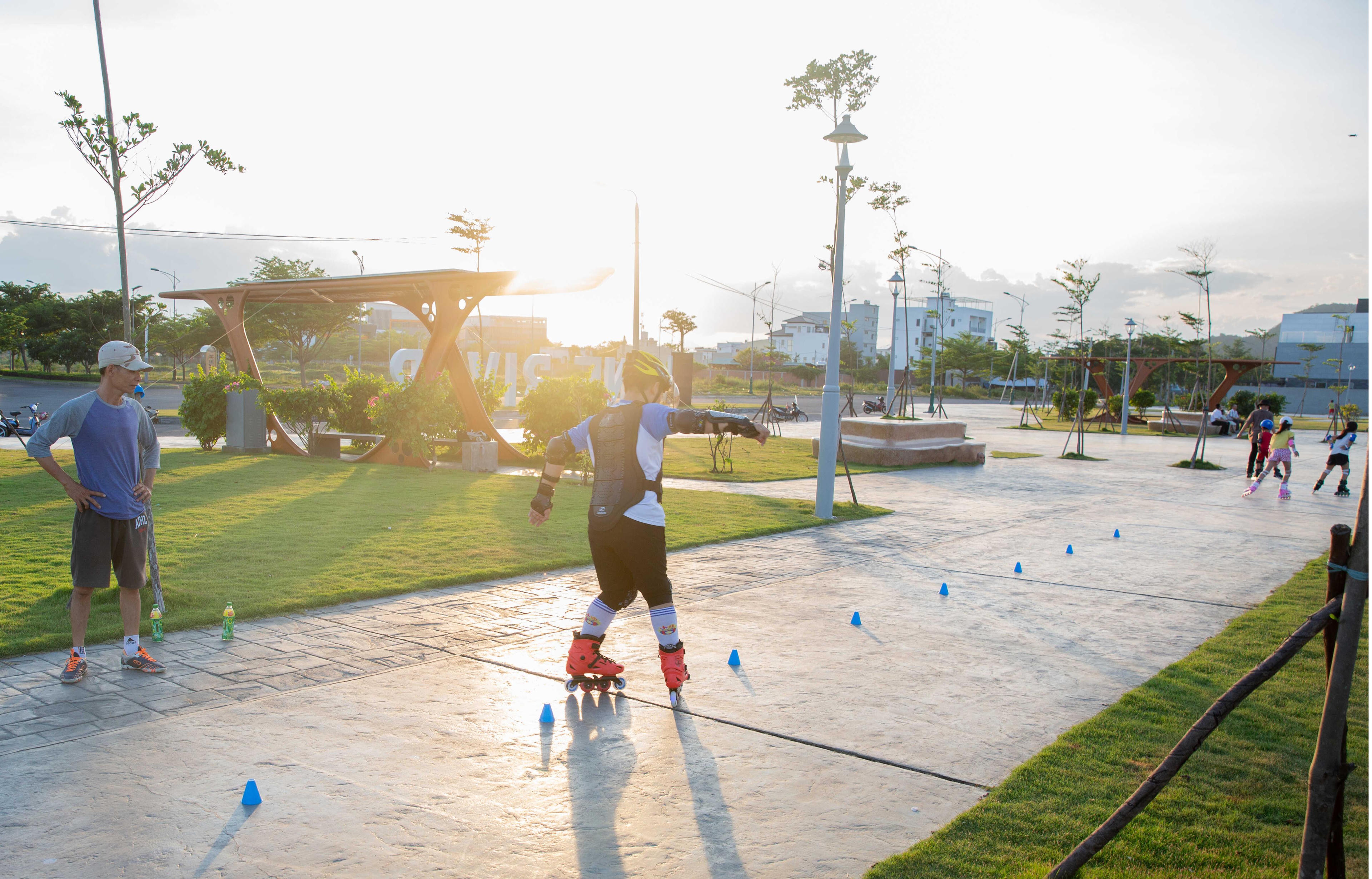 Quảng trường ven sông, không gian thiên nhiên với thảm cỏ xanh, đón cư dân giải trí với nhiều hoạt động thể chất chăm sóc sức khỏe. |